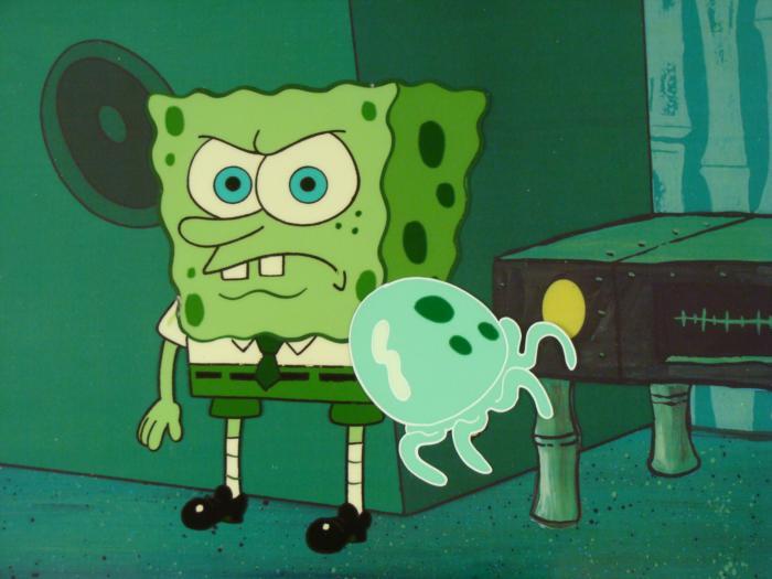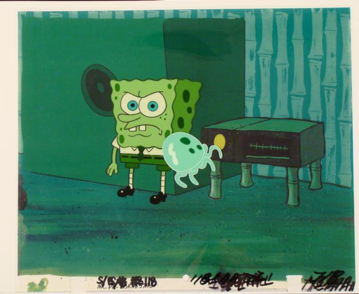 This original animation cel and reproduction background are from the Nickelodeon TV show SpongeBob Squarepants. The story takes place under the deep blue sea in Bikini Bottom, where SpongeBob resides. SpongeBob, who is a yellow, porous sponge, is your typical happy-go-lucky character, as he is always cheerful and enjoys making people laugh. Patrick Star, SpongeBob's neighbor who is a starfish, is your average children's show idiot, as he boasts knowing nothing and is often getting himself into ridiculous situations. Between the homes of these two lies the home of the miserable Squidward, a squid, who is known for being grouchy and playing tricks on SpongeBob and Patrick. Both SpongeBob and Squidward work at the Krusty Krab, a fast food business run by the greedy money-loving Mr. Krabs, a crab, the arch rival of the evil, possibly misunderstood, Plankton. Another neighbor, Sandy Cheeks, an athletic squirrel who normally wears an astronaut's space suit, was introduced in "Tea at the Treedome." She spends most of her time inventing and experimenting. Spongebob doesn't appear to be too happy. Suppossingly this jellyfish has turned his world upside down by making everything green.Original Animated Cel and Reproduction BackgroundOverall Size of Background: 11" x 17" Overall Size of the Cels: 10 1/2" x 12 1/2" Very Good ConditionThis is an original hand-painted cel set-up used in the production of an episode of "SpongeBob SquarePants." Each one-of-a-kind set-up represents a slight change in position of the characters. When individually photographed and projected in rapid succession, the images appear to move.