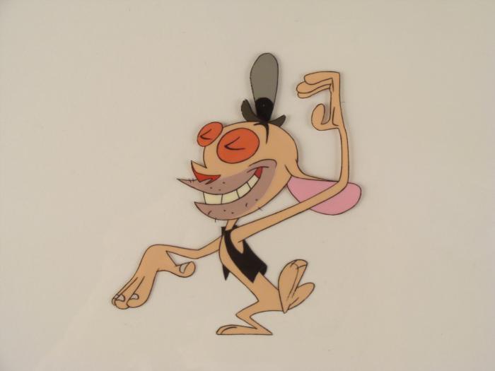 This is an original production animation cel from the Nickelodeon TV show Ren & Stimpy. The show follows two characters - Ren, a crazy Chihuahua - and - Stimpy, an incredibly stupid cat - as they think up to all kinds of hair brained schemes and get themselves into some sticky situations. The Ren and Stimpy Show debuted in August 1991 with a two-part episode, 'Stimpy's Big Day / The Big Shot' and became an instant hit. It was the third Nicktoon ever to be aired on the Network alongside Doug and Rugrats. Ren is doing what looks like a "happy dance".Original Production Art Cel Overall Size of the Cel: 10 1/2" x 12 1/2" Excellent condition This is an original hand-painted cel set-up used in the production of an episode of "The Ren & Stimpy Show." Each one-of-a-kind set-up represents a slight change in position of the characters. When individually photographed and projected in rapid succession, the images appear to move.