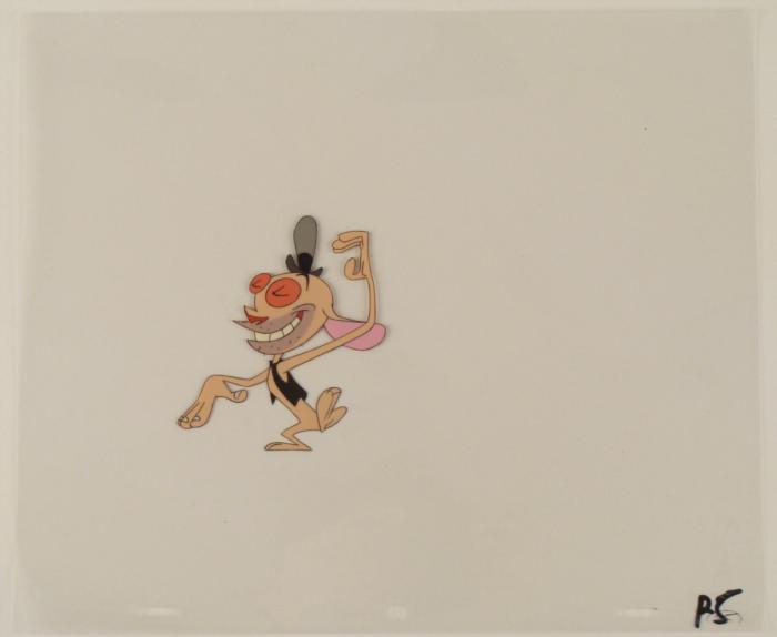 This is an original production animation cel from the Nickelodeon TV show Ren & Stimpy. The show follows two characters - Ren, a crazy Chihuahua - and - Stimpy, an incredibly stupid cat - as they think up to all kinds of hair brained schemes and get themselves into some sticky situations. The Ren and Stimpy Show debuted in August 1991 with a two-part episode, 'Stimpy's Big Day / The Big Shot' and became an instant hit. It was the third Nicktoon ever to be aired on the Network alongside Doug and Rugrats. Ren is doing what looks like a "happy dance".Original Production Art Cel Overall Size of the Cel: 10 1/2" x 12 1/2" Excellent condition This is an original hand-painted cel set-up used in the production of an episode of "The Ren & Stimpy Show." Each one-of-a-kind set-up represents a slight change in position of the characters. When individually photographed and projected in rapid succession, the images appear to move.