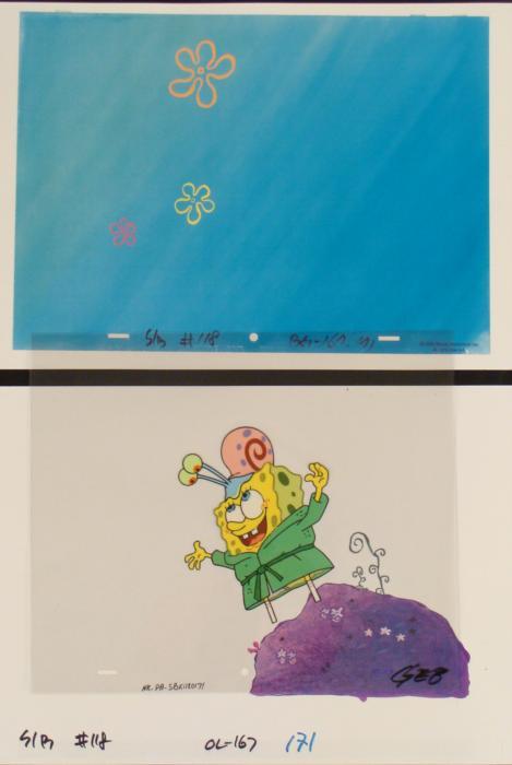 Offered here are two reproduction backgrounds (over and underlay) and an original animation cel from the Nickelodeon TV show SpongeBob Squarepants. The story takes place under the deep blue sea in Bikini Bottom, where SpongeBob resides. SpongeBob, who is a yellow, porous sponge, is your typical happy-go-lucky character, as he is always cheerful and enjoys making people laugh. Patrick Star, SpongeBob's neighbor who is a starfish, is your average children's show idiot, as he boasts knowing nothing and is often getting himself into ridiculous situations. Between the homes of these two lies the home of the miserable Squidward, a squid, who is known for being grouchy and playing tricks on SpongeBob and Patrick. Both SpongeBob and Squidward work at the Krusty Krab, a fast food business run by the greedy money-loving Mr. Krabs, a crab, the arch rival of the evil, possibly misunderstood, Plankton. Another neighbor, Sandy Cheeks, an athletic squirrel who normally wears an astronaut's space suit, was introduced in "Tea at the Treedome." She spends most of her time inventing and experimenting. Don't worry Gary, I have very good balance. Original Production Background and Animated Cel Overall Size of Background: 11" x 17" Overall Size of the Cels: 10 1/2" x 14" Excellent ConditionThis is an original hand-painted cel set-up used in the production of an episode of "SpongeBob SquarePants." Each one-of-a-kind set-up represents a slight change in position of the characters. When individually photographed and projected in rapid succession, the images appear to move.