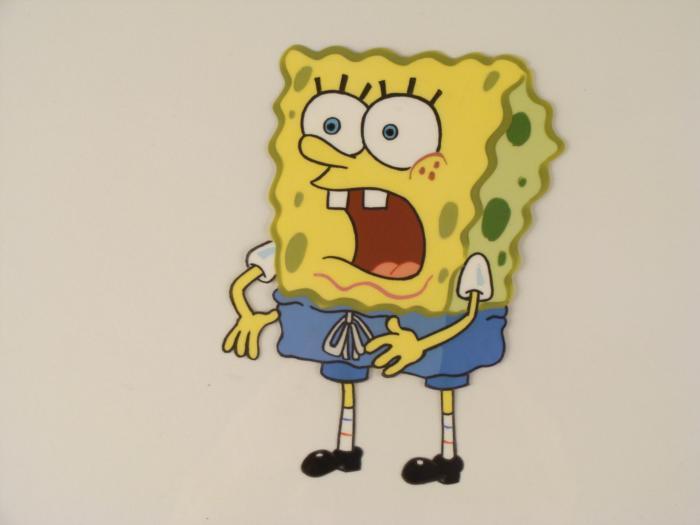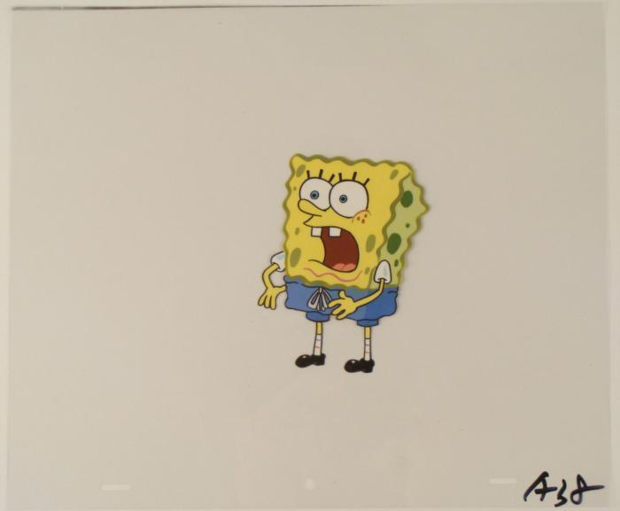 This original animation cel is from the Nickelodeon TV show SpongeBob Squarepants. The story takes place under the deep blue sea in Bikini Bottom, where SpongeBob resides. SpongeBob, who is a yellow, porous sponge, is your typical happy-go-lucky character, as he is always cheerful and enjoys making people laugh. Patrick Star, SpongeBob's neighbor who is a starfish, is your average children's show idiot, as he boasts knowing nothing and is often getting himself into ridiculous situations. Between the homes of these two lies the home of the miserable Squidward, a squid, who is known for being grouchy and playing tricks on SpongeBob and Patrick. Both SpongeBob and Squidward work at the Krusty Krab, a fast food business run by the greedy money-loving Mr. Krabs, a crab, the arch rival of the evil, possibly misunderstood, Plankton. Another neighbor, Sandy Cheeks, an athletic squirrel who normally wears an astronaut's space suit, was introduced in "Tea at the Treedome." She spends most of her time inventing and experimenting. What happened to SpongeBob?Original Production Animated Cel Overall Size of Cel: 10 1/2" x 12 1/2" Very Good ConditionThis is an original hand-painted cel set-up used in the production of an episode of "SpongeBob SquarePants." Each one-of-a-kind set-up represents a slight change in position of the characters. When individually photographed and projected in rapid succession, the images appear to move.