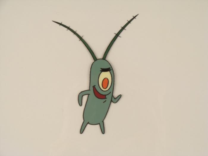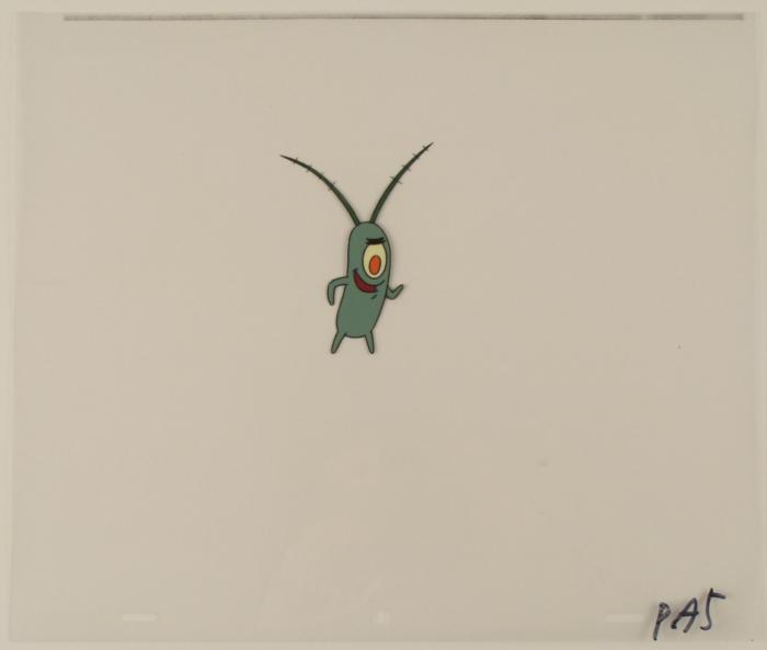 This original animation cel is from the Nickelodeon TV show SpongeBob Squarepants. The story takes place under the deep blue sea in Bikini Bottom, where SpongeBob resides. SpongeBob, who is a yellow, porous sponge, is your typical happy-go-lucky character, as he is always cheerful and enjoys making people laugh. Patrick Star, SpongeBob's neighbor who is a starfish, is your average children's show idiot, as he boasts knowing nothing and is often getting himself into ridiculous situations. Between the homes of these two lies the home of the miserable Squidward, a squid, who is known for being grouchy and playing tricks on SpongeBob and Patrick. Both SpongeBob and Squidward work at the Krusty Krab, a fast food business run by the greedy money-loving Mr. Krabs, a crab, the arch rival of the evil, possibly misunderstood, Plankton. Another neighbor, Sandy Cheeks, an athletic squirrel who normally wears an astronaut's space suit, was introduced in "Tea at the Treedome." She spends most of her time inventing and experimenting. Plankton seems to be very happy about something.Original Production Animated Cel Overall Size of Cel: 10 1/2" x 12 1/2" Excellent ConditionThis is an original hand-painted cel set-up used in the production of an episode of "SpongeBob SquarePants." Each one-of-a-kind set-up represents a slight change in position of the characters. When individually photographed and projected in rapid succession, the images appear to move.
