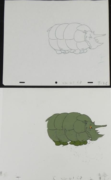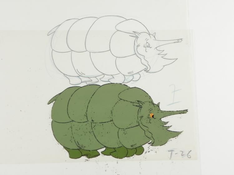 The Herculoids battled to defend their planet from menaces on * Amzot/Quasar and from outer space. All of the Herculoids displayed * Human-level intelligence - employing precision teamwork and complex * tactics - as well as emotions, and Zandor and Tara both * displayed a working knowledge of complex alien technologies as well as * the ability to pilot interstellar spacecraft—but essentially, Zandor, * Tara, Dorno, and the Herculoids were fighting to keep Amzot/Quasar a * technology-free, primitive planet. This is further * indicated by the pseudo-barbarian outfits of Zandor, Tara, and Dorno * and the fact that technology was used mainly by the various villains, * but rarely if ever by the heroes. Although the "speech" of their * companions was limited and repetitive, Zandor, Tara * and Dorno demonstrated that Gloop and Gleep, at least, had a * comprehensive mode of communication, and that they could at least * understand and interpret this language. * * * * **The cel and drawing are at least 35 years old. * * * * Now this is going to be fun... * * * * Original Animation * and Drawing * * Original * "rough" animation drawing, in black and non-photo blue pencil with the * notations in black. * * * Overall * Size of Drawing: 10 1/2" x 12 1/2" * Overall * Size of the Cel: 10 1/2" x 12 1/2" * Overall condition: Cel- Good wear to cel and Drawing- * ExcellentThis is * an original hand-painted cel set-up used in the production of * an episode of "Herculoids." Each one-of-a-kind set-up represents a * slight change in position of the characters. When individually * photographed and projected in rapid succession, the images * appear to move. To create production cels, the original * animator's drawing is * transferred onto an acetate cel (by hand-inking and/or photo copying). * The cel is then hand-painted on the reverse side. * * The drawing and cel are ready to be matted and * framed. The notations are located at the bottom of * the drawing and cel.