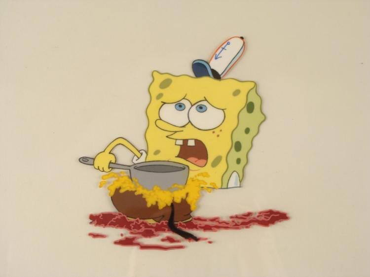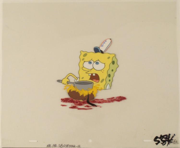 This original animation cel is from the Nickelodeon TV show SpongeBob Squarepants. The story takes place under the deep blue sea in Bikini Bottom, where SpongeBob resides. SpongeBob, who is a yellow, porous sponge, is your typical happy-go-lucky character, as he is always cheerful and enjoys making people laugh. Patrick Star, SpongeBob's neighbor who is a starfish, is your average children's show idiot, as he boasts knowing nothing and is often getting himself into ridiculous situations. Between the homes of these two lies the home of the miserable Squidward, a squid, who is known for being grouchy and playing tricks on SpongeBob and Patrick. Both SpongeBob and Squidward work at the Krusty Krab, a fast food business run by the greedy money-loving Mr. Krabs, a crab, the arch rival of the evil, possibly misunderstood, Plankton. Another neighbor, Sandy Cheeks, an athletic squirrel who normally wears an astronaut's space suit, was introduced in "Tea at the Treedome." She spends most of her time inventing and experimenting. * Remind me again, why am I doing thins??? * Original Production Animated Cel Overall Size of Cel: 10 1/2" x 12 1/2" Very Good Condition This is an original hand-painted cel set-up used in the production of an episode of "SpongeBob SquarePants." Each one-of-a-kind set-up represents a slight change in position of the characters. When individually photographed and projected in rapid succession, the images appear to move. * To create production cels, the original animator's drawing is transferred onto an acetate cel (by hand-inking and/or photo copying). The cel is then hand-painted on the reverse side. * The cel is ready to be matted and framed. The animator's notations are at the bottom of the cel. The cel is multi-layered, first is the splatter of red sauce and next is the main image. There is some red paint and paper residue on the back of the cel. *