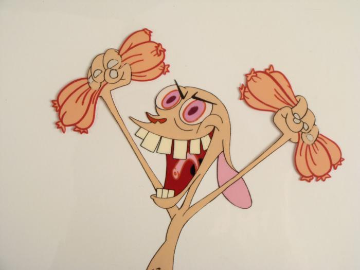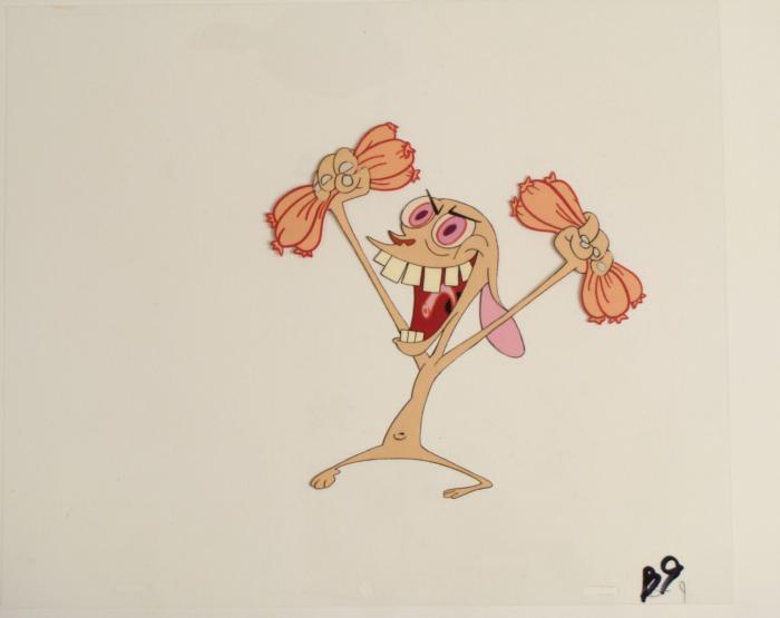 This is an original production animation cel from the Nickelodeon TV show Ren & Stimpy. The show follows two characters - Ren, a crazy Chihuahua - and - Stimpy, an incredibly stupid cat - as they think up to all kinds of hair brained schemes and get themselves into some sticky situations. The Ren and Stimpy Show debuted in August 1991 with a two-part episode, 'Stimpy's Big Day / The Big Shot' and became an instant hit. It was the third Nicktoon ever to be aired on the Network alongside Doug and Rugrats. Ren is holding many wienersOriginal Production Art Cel Overall Size of the Cel: 10 1/2" x 1/2" Very Good condition This is an original hand-painted cel set-up used in the production of an episode of "The Ren & Stimpy Show." Each one-of-a-kind set-up represents a slight change in position of the characters. When individually photographed and projected in rapid succession, the images appear to move.