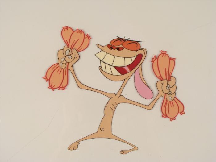 This is an original production animation cel from the Nickelodeon TV show Ren & Stimpy. The show follows two characters - Ren, a crazy Chihuahua - and - Stimpy, an incredibly stupid cat - as they think up to all kinds of hair brained schemes and get themselves into some sticky situations. The Ren and Stimpy Show debuted in August 1991 with a two-part episode, 'Stimpy's Big Day / The Big Shot' and became an instant hit. It was the third Nicktoon ever to be aired on the Network alongside Doug and Rugrats. Ren seems to be very happy that he has many weiners.Original Production Art Cel Overall Size of the Cel: 10 1/2" x 12 1/2" Very Good condition This is an original hand-painted cel set-up used in the production of an episode of "The Ren & Stimpy Show." Each one-of-a-kind set-up represents a slight change in position of the characters. When individually photographed and projected in rapid succession, the images appear to move.