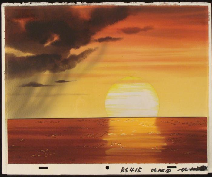 To create production cels, the original animator's drawing is transferred onto an acetate cel (by hand-inking and/or photo copying). The cel is then hand-painted on the reverse side. The background accompanying this set-up is a hand-painted original production background.The background is to be matted and framed. It is a colored background with the animator's notations shown at the bottom of both. The art is a paper cut-out that is pasted onto the cel.