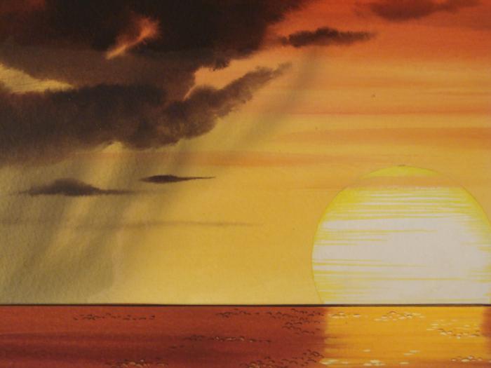 This original production art cel and background is from the Nickelodeon TV show Ren & Stimpy. The show follows two characters - Ren, a crazy Chihuahua - and - Stimpy, an incredibly stupid cat - as they think up to all kinds of hair brained schemes and get themselves into some sticky situations. The Ren and Stimpy Show debuted in August 1991 with a two-part episode, 'Stimpy's Big Day / The Big Shot' and became an instant hit. It was the third Nicktoon ever to be aired on the Network alongside Doug and Rugrats. What a beautiful sunset...Original Production Background and Animation CelOverall Size: 10 3/4" x 13" Very good condition; it has been storedThis is an original hand-painted cel set-up used in the production of an episode of "The Ren & Stimpy Show." Each one-of-a-kind set-up represents a slight change in position of the characters. When individually photographed and projected in rapid succession, the images appear to move.