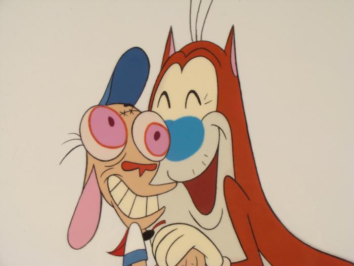 This is an original production animation cel from the Nickelodeon TV show Ren & Stimpy. The show follows two characters - Ren, a crazy Chihuahua - and - Stimpy, an incredibly stupid cat - as they think up to all kinds of hair brained schemes and get themselves into some sticky situations. The Ren and Stimpy Show debuted in August 1991 with a two-part episode, 'Stimpy's Big Day / The Big Shot' and became an instant hit. It was the third Nicktoon ever to be aired on the Network alongside Doug and Rugrats. Ren and Stimpy seem to be hugging.Original Production Art Cel Overall Size of the Cel: 10 1/2" x 12 1/2" Very Good condition This is an original hand-painted cel set-up used in the production of an episode of "The Ren & Stimpy Show." Each one-of-a-kind set-up represents a slight change in position of the characters. When individually photographed and projected in rapid succession, the images appear to move.
