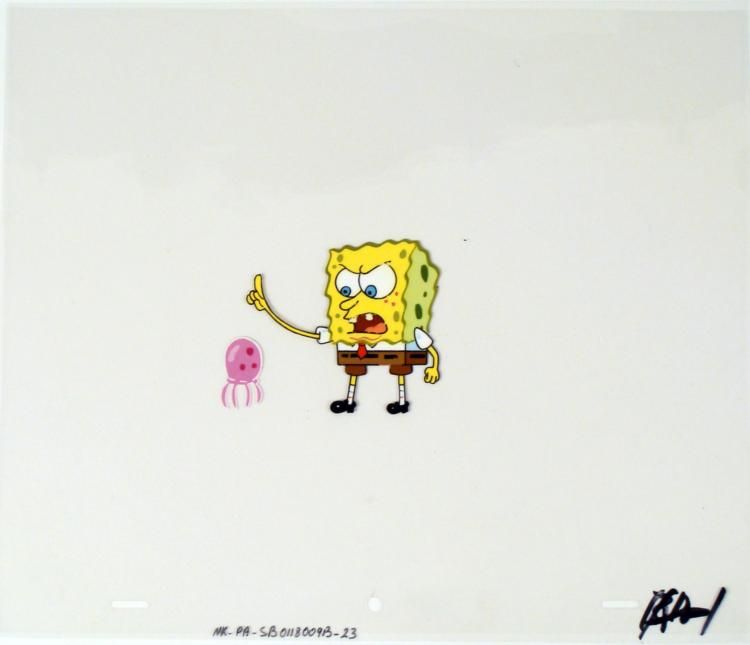 This original animation cel is from the Nickelodeon TV show SpongeBob Squarepants. The story takes place under the deep blue sea in Bikini Bottom, where SpongeBob resides. SpongeBob, who is a yellow, porous sponge, is your typical happy-go-lucky character, * as he is always cheerful and enjoys making people laugh. Patrick Star, SpongeBob's neighbor who is a starfish, is your average children's show idiot, as he boasts knowing nothing and is often getting himself into ridiculous situations. Between the homes of * these two lies the home of the miserable Squidward, a squid, who is known for being grouchy and playing tricks on SpongeBob and Patrick. Both SpongeBob and Squidward work at the Krusty Krab, a fast food business run by the greedy money-loving Mr. Krabs, a * crab, the arch rival of the evil, possibly misunderstood, Plankton. Another neighbor, Sandy Cheeks, an athletic squirrel who normally wears an astronaut's space suit, was introduced in "Tea at the Treedome." She spends most of her time inventing and experimenting. * * Who do you think you are?!?!? I'm the one in charge, not you, I make the rules, you don't... * * * * * Original Production Animated Cel Overall Size of Cel: 10 1/2" x 12 1/2" Very Good Condition * This is an original hand-painted cel was used in the production of an episode of "SpongeBob SquarePants." Each one-of-a-kind cel * represents a slight change in position of the characters. When individually photographed and projected in rapid succession, the images appear to move. * * To create production cels, the original animator's drawing is transferred onto an acetate cel (by hand-inking and/or photo copying). The cel is then hand-painted on the reverse side. * * * The cel is ready to be matted and framed. The animator's notations are at the bottom of the cel. There is some slight paint fade to Spongebob's outline. * * *