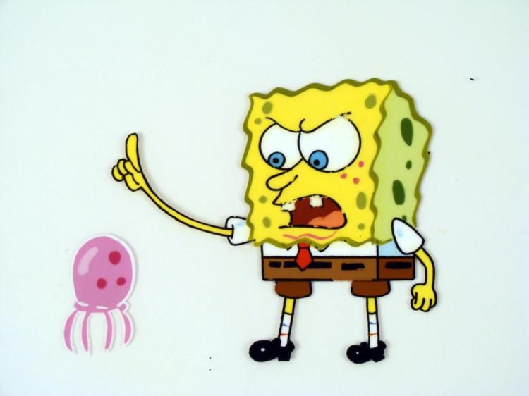This original animation cel is from the Nickelodeon TV show SpongeBob Squarepants. The story takes place under the deep blue sea in Bikini Bottom, where SpongeBob resides. SpongeBob, who is a yellow, porous sponge, is your typical happy-go-lucky character, * as he is always cheerful and enjoys making people laugh. Patrick Star, SpongeBob's neighbor who is a starfish, is your average children's show idiot, as he boasts knowing nothing and is often getting himself into ridiculous situations. Between the homes of * these two lies the home of the miserable Squidward, a squid, who is known for being grouchy and playing tricks on SpongeBob and Patrick. Both SpongeBob and Squidward work at the Krusty Krab, a fast food business run by the greedy money-loving Mr. Krabs, a * crab, the arch rival of the evil, possibly misunderstood, Plankton. Another neighbor, Sandy Cheeks, an athletic squirrel who normally wears an astronaut's space suit, was introduced in "Tea at the Treedome." She spends most of her time inventing and experimenting. * * Who do you think you are?!?!? I'm the one in charge, not you, I make the rules, you don't... * * * * * Original Production Animated Cel Overall Size of Cel: 10 1/2" x 12 1/2" Very Good Condition * This is an original hand-painted cel was used in the production of an episode of "SpongeBob SquarePants." Each one-of-a-kind cel * represents a slight change in position of the characters. When individually photographed and projected in rapid succession, the images appear to move. * * To create production cels, the original animator's drawing is transferred onto an acetate cel (by hand-inking and/or photo copying). The cel is then hand-painted on the reverse side. * * * The cel is ready to be matted and framed. The animator's notations are at the bottom of the cel. There is some slight paint fade to Spongebob's outline. * * *