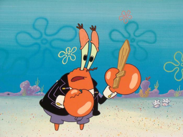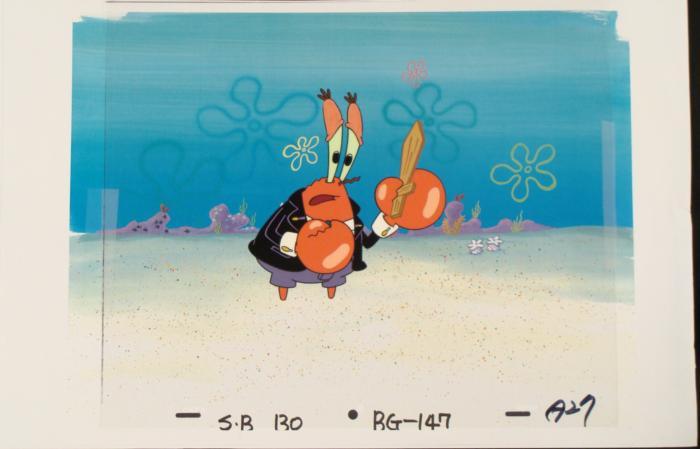 This animation cel and reproduction background are from the Nickelodeon TV show SpongeBob Squarepants. The story takes place under the deep blue sea in Bikini Bottom, where SpongeBob resides. SpongeBob, who is a yellow, porous sponge, is your typical happy-go-lucky character, as he is always cheerful and enjoys making people laugh. Patrick Star, SpongeBob's neighbor who is a starfish, is your average children's show idiot, as he boasts knowing nothing and is often getting himself into ridiculous situations. Between the homes of these two lies the home of the miserable Squidward, a squid, who is known for being grouchy and playing tricks on SpongeBob and Patrick. Both SpongeBob and Squidward work at the Krusty Krab, a fast food business run by the greedy money-loving Mr. Krabs, a crab, the arch rival of the evil, possibly misunderstood, Plankton. Another neighbor, Sandy Cheeks, an athletic squirrel who normally wears an astronaut's space suit, was introduced in "Tea at the Treedome." She spends most of her time inventing and experimenting. Mr. Krabs appears to be sad.Original Printed Background and Animated Cel Overall Size of Background: 11" x 17" Overall Size of the Cel: 10 1/2" x 12 1/2" Very good condition; it has been storedThis is an original hand-painted cel set-up used in the production of an episode of "SpongeBob SquarePants." Each one-of-a-kind set-up represents a slight change in position of the characters. When individually photographed and projected in rapid succession, the images appear to move.