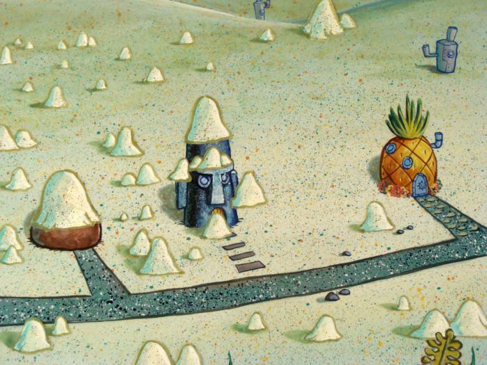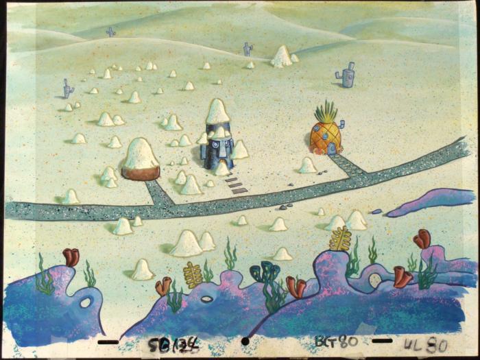 This original hand-painted background and animation cel is from the Nickelodeon TV show SpongeBob Squarepants. The story takes place under the deep blue sea in Bikini Bottom, where SpongeBob resides. SpongeBob, who is a yellow, porous sponge, is your typical happy-go-lucky character, as he is always cheerful and enjoys making people laugh. Patrick Star, SpongeBob's neighbor who is a starfish, is your average children's show idiot, as he boasts knowing nothing and is often getting himself into ridiculous situations. Between the homes of these two lies the home of the miserable Squidward, a squid, who is known for being grouchy and playing tricks on SpongeBob and Patrick. Both SpongeBob and Squidward work at the Krusty Krab, a fast food business run by the greedy money-loving Mr. Krabs, a crab, the arch rival of the evil, possibly misunderstood, Plankton. Another neighbor, Sandy Cheeks, an athletic squirrel who normally wears an astronaut's space suit, was introduced in "Tea at the Treedome." She spends most of her time inventing and experimenting. Good luck finding your way out of this mess of sand! Original Production Background and Animated Cel Overall Size of Background: 10 1/2" x 14" Overall Size of the Cels: 10 1/2" x 12 1/2" Very good condition; it has been stored This is an original hand-painted cel set-up used in the production of an episode of "SpongeBob SquarePants." Each one-of-a-kind set-up represents a slight change in position of the characters. When individually photographed and projected in rapid succession, the images appear to move.