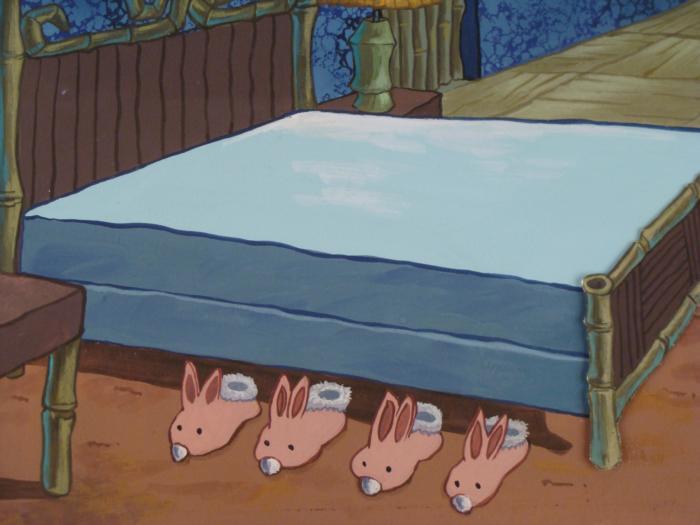 This original hand-painted background and animation cel is from the Nickelodeon TV show SpongeBob Squarepants. The story takes place under the deep blue sea in Bikini Bottom, where SpongeBob resides. SpongeBob, who is a yellow, porous sponge, is your typical happy-go-lucky character, as he is always cheerful and enjoys making people laugh. Patrick Star, SpongeBob's neighbor who is a starfish, is your average children's show idiot, as he boasts knowing nothing and is often getting himself into ridiculous situations. Between the homes of these two lies the home of the miserable Squidward, a squid, who is known for being grouchy and playing tricks on SpongeBob and Patrick. Both SpongeBob and Squidward work at the Krusty Krab, a fast food business run by the greedy money-loving Mr. Krabs, a crab, the arch rival of the evil, possibly misunderstood, Plankton. Another neighbor, Sandy Cheeks, an athletic squirrel who normally wears an astronaut's space suit, was introduced in "Tea at the Treedome." She spends most of her time inventing and experimenting. Shown here is a bedroom with pink bunny slippers sitting on the floor next to the bed. Original Production Background and Animated Cel Overall Size of Background: 10 1/2" x 14 1/4" Overall Size of the Cels 10 1/2" x 12 1/2" Very good condition; it has been stored This is an original hand-painted cel set-up used in the production of an episode of "SpongeBob SquarePants." Each one-of-a-kind set-up represents a slight change in position of the characters. When individually photographed and projected in rapid succession, the images appear to move.