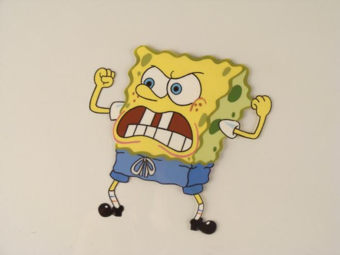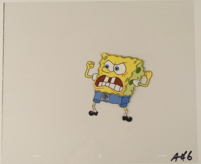 This original animation cel is from the Nickelodeon TV show SpongeBob Squarepants. The story takes place under the deep blue sea in Bikini Bottom, where SpongeBob resides. SpongeBob, who is a yellow, porous sponge, is your typical happy-go-lucky character, as he is always cheerful and enjoys making people laugh. Patrick Star, SpongeBob's neighbor who is a starfish, is your average children's show idiot, as he boasts knowing nothing and is often getting himself into ridiculous situations. Between the homes of these two lies the home of the miserable Squidward, a squid, who is known for being grouchy and playing tricks on SpongeBob and Patrick. Both SpongeBob and Squidward work at the Krusty Krab, a fast food business run by the greedy money-loving Mr. Krabs, a crab, the arch rival of the evil, possibly misunderstood, Plankton. Another neighbor, Sandy Cheeks, an athletic squirrel who normally wears an astronaut's space suit, was introduced in "Tea at the Treedome." She spends most of her time inventing and experimenting. Why is SpongeBob so mad?Original Production Animated Cel Overall Size of Cel: 10 1/2" x 12 1/2" Very Good ConditionThis is an original hand-painted cel set-up used in the production of an episode of "SpongeBob SquarePants." Each one-of-a-kind set-up represents a slight change in position of the characters. When individually photographed and projected in rapid succession, the images appear to move.