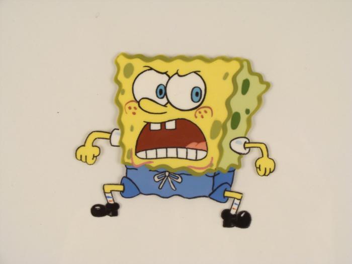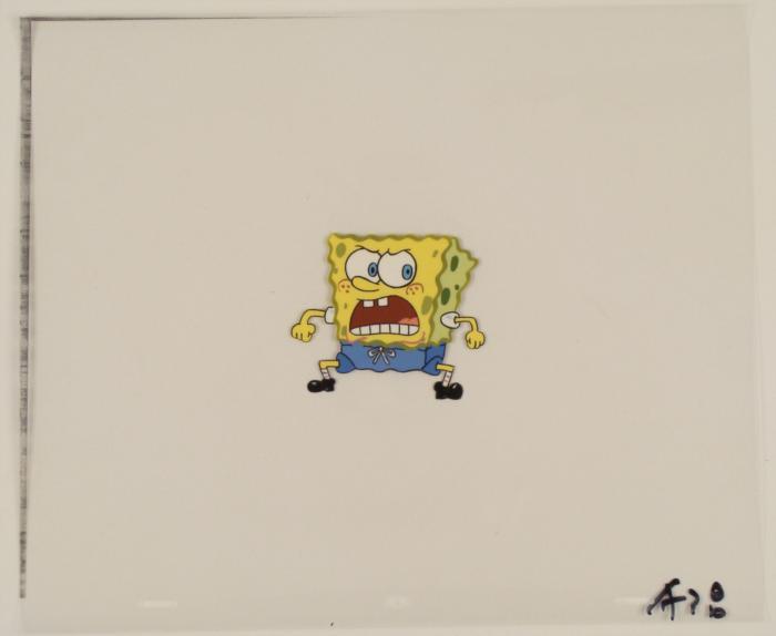 This original animation cel is from the Nickelodeon TV show SpongeBob Squarepants. The story takes place under the deep blue sea in Bikini Bottom, where SpongeBob resides. SpongeBob, who is a yellow, porous sponge, is your typical happy-go-lucky character, as he is always cheerful and enjoys making people laugh. Patrick Star, SpongeBob's neighbor who is a starfish, is your average children's show idiot, as he boasts knowing nothing and is often getting himself into ridiculous situations. Between the homes of these two lies the home of the miserable Squidward, a squid, who is known for being grouchy and playing tricks on SpongeBob and Patrick. Both SpongeBob and Squidward work at the Krusty Krab, a fast food business run by the greedy money-loving Mr. Krabs, a crab, the arch rival of the evil, possibly misunderstood, Plankton. Another neighbor, Sandy Cheeks, an athletic squirrel who normally wears an astronaut's space suit, was introduced in "Tea at the Treedome." She spends most of her time inventing and experimenting. What is SpongeBob doing?Original Production Animated Cel Overall Size of Cel: 10 1/2" x 12 1/2" Very Good ConditionThis is an original hand-painted cel set-up used in the production of an episode of "SpongeBob SquarePants." Each one-of-a-kind set-up represents a slight change in position of the characters. When individually photographed and projected in rapid succession, the images appear to move.