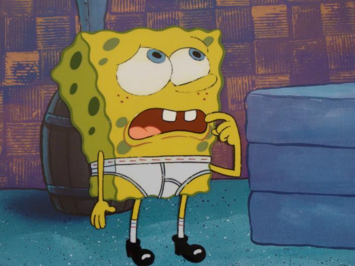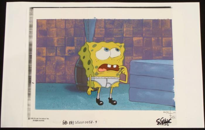This animation cel and reproduction background are from the Nickelodeon TV show SpongeBob Squarepants. The story takes place under the deep blue sea in Bikini Bottom, where SpongeBob resides. SpongeBob, who is a yellow, porous sponge, is your typical happy-go-lucky character, as he is always cheerful and enjoys making people laugh. Patrick Star, SpongeBob's neighbor who is a starfish, is your average children's show idiot, as he boasts knowing nothing and is often getting himself into ridiculous situations. Between the homes of these two lies the home of the miserable Squidward, a squid, who is known for being grouchy and playing tricks on SpongeBob and Patrick. Both SpongeBob and Squidward work at the Krusty Krab, a fast food business run by the greedy money-loving Mr. Krabs, a crab, the arch rival of the evil, possibly misunderstood, Plankton. Another neighbor, Sandy Cheeks, an athletic squirrel who normally wears an astronaut's space suit, was introduced in "Tea at the Treedome." She spends most of her time inventing and experimenting. What is that green goop surrounding Spongebob's mouth?Original Printed Background and Animated Cel Overall Size of Background: 11" x 17" Overall Size of the Cel: 10 1/2" x 12 1/2" Very good condition This is an original hand-painted cel set-up used in the production of an episode of "SpongeBob SquarePants." Each one-of-a-kind set-up represents a slight change in position of the characters. When individually photographed and projected in rapid succession, the images appear to move.