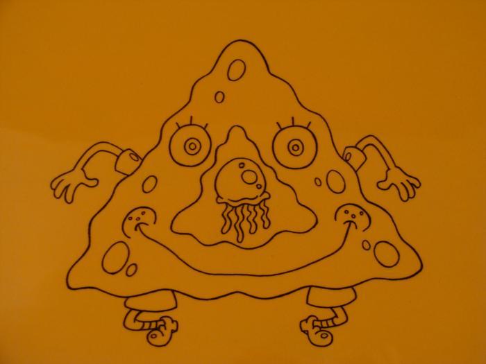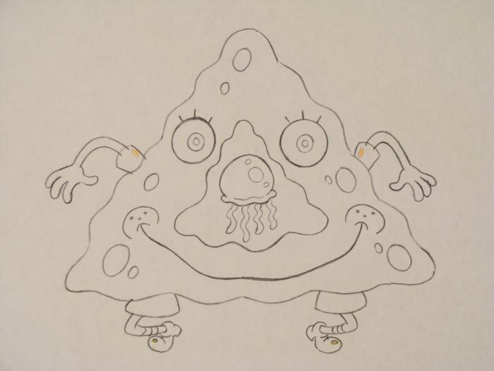 To create production cels, the original animator's drawing is transferred onto an acetate cel (by hand-inking and/or photo copying). The cel is then hand-painted on the reverse side. The cel and drawing are ready to be matted and framed. The animator's notations are at the bottom of both. The cel is multi-layered: first is Spongebob and then is a painted orange cel.