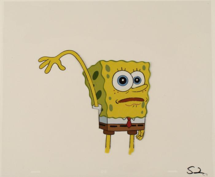 This original animation cel is from the Nickelodeon TV show SpongeBob Squarepants. The story takes place under the deep blue sea in Bikini Bottom, where SpongeBob resides. SpongeBob, who is a yellow, porous sponge, is your typical happy-go-lucky character, as he is always cheerful and enjoys making people laugh. Patrick Star, SpongeBob's neighbor who is a starfish, is your average children's show idiot, as he boasts knowing nothing and is often getting himself into ridiculous situations. Between the homes of these two lies the home of the miserable Squidward, a squid, who is known for being grouchy and playing tricks on SpongeBob and Patrick. Both SpongeBob and Squidward work at the Krusty Krab, a fast food business run by the greedy money-loving Mr. Krabs, a crab, the arch rival of the evil, possibly misunderstood, Plankton. Another neighbor, Sandy Cheeks, an athletic squirrel who normally wears an astronaut's space suit, was introduced in "Tea at the Treedome." She spends most of her time inventing and experimenting. 'SpongeBob is about to touch something.Original Production Animated Cel Overall Size of Cel: 10 1/2" x 12 1/2" Very Good ConditionThis is an original hand-painted cel set-up used in the production of an episode of "SpongeBob SquarePants." Each one-of-a-kind set-up represents a slight change in position of the characters. When individually photographed and projected in rapid succession, the images appear to move.