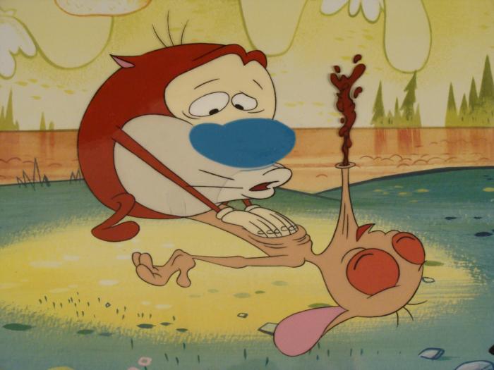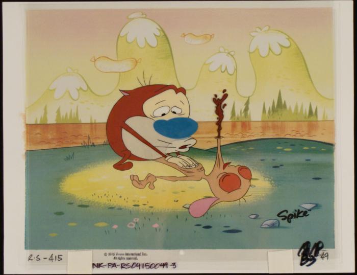 This original production art cel and reproduction background is from the Nickelodeon TV show Ren & Stimpy. The show follows two characters - Ren, a crazy Chihuahua - and - Stimpy, an incredibly stupid cat - as they think up to all kinds of hair brained schemes and get themselves into some sticky situations. The Ren and Stimpy Show debuted in August 1991 with a two-part episode, 'Stimpy's Big Day / The Big Shot' and became an instant hit. It was the third Nicktoon ever to be aired on the Network alongside Doug and Rugrats. Stimpy is giving Ren CPR, who's spurting out coffee unconsciouslyOriginal Production Art Cel and Reproduction BackgroundOverall Size: 11" x 14 1/2"Excellent condition This is an original hand-painted cel set-up used in the production of an episode of "The Ren & Stimpy Show." Each one-of-a-kind set-up represents a slight change in position of the characters. When individually photographed and projected in rapid succession, the images appear to move.