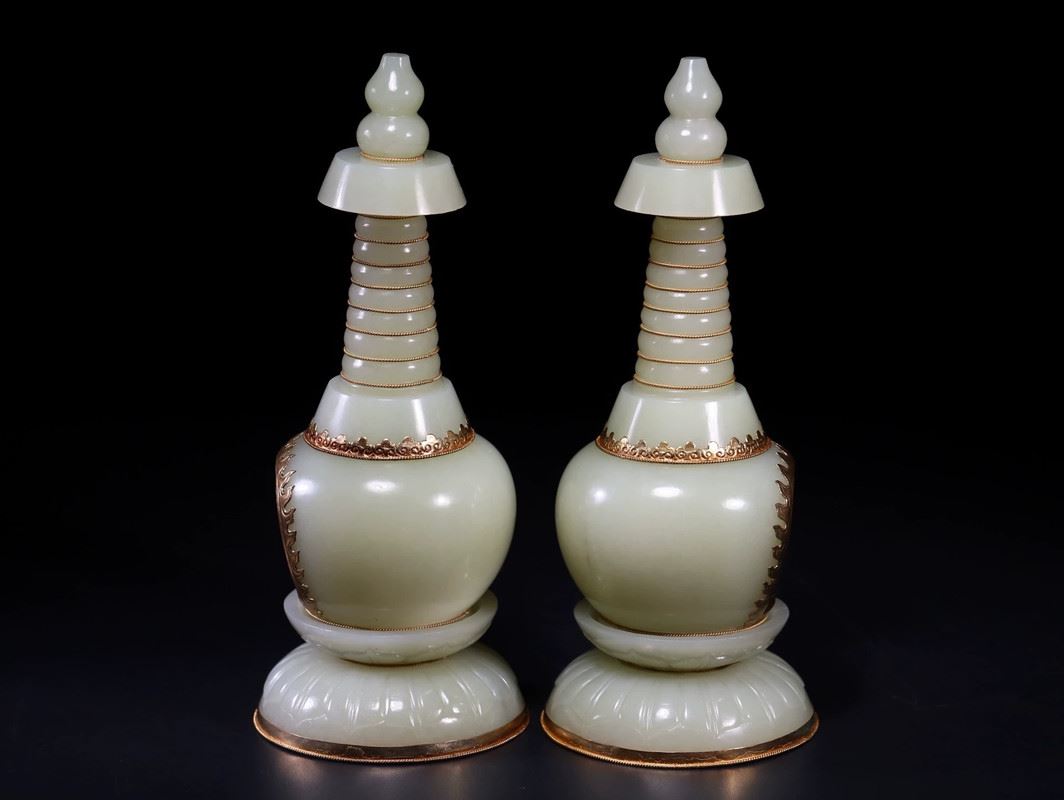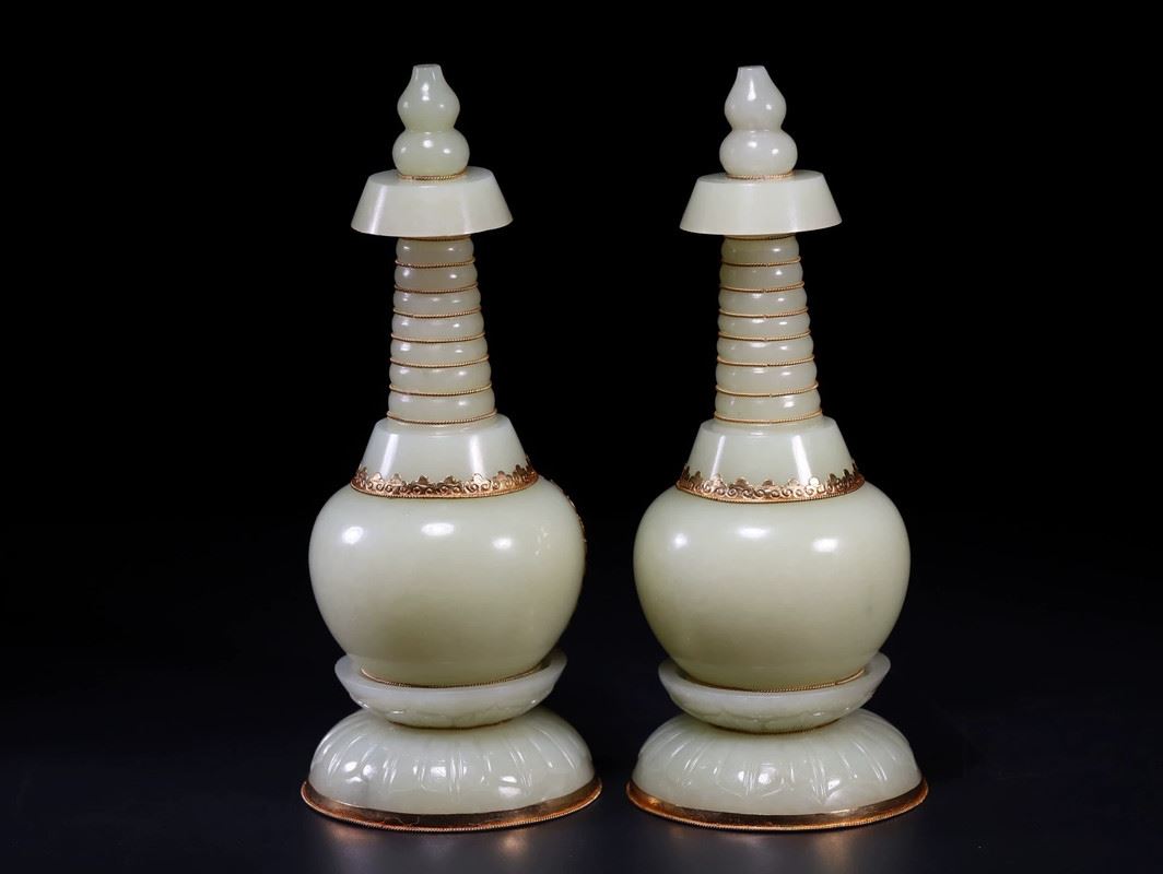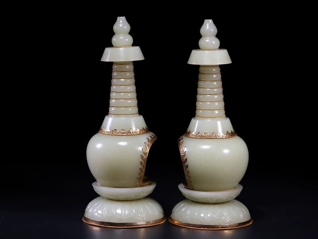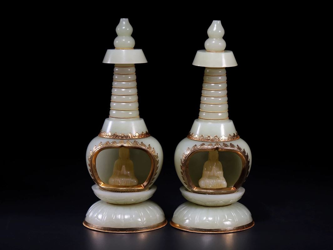 A pair of exquisite celadon lamps, each featuring a spiraled tower design, with a serene Buddha figure inside the base. The lamps are adorned with golden accents, enhancing their elegance. These pieces exude both tranquility and sophistication, making them a striking addition to any collection or living space.