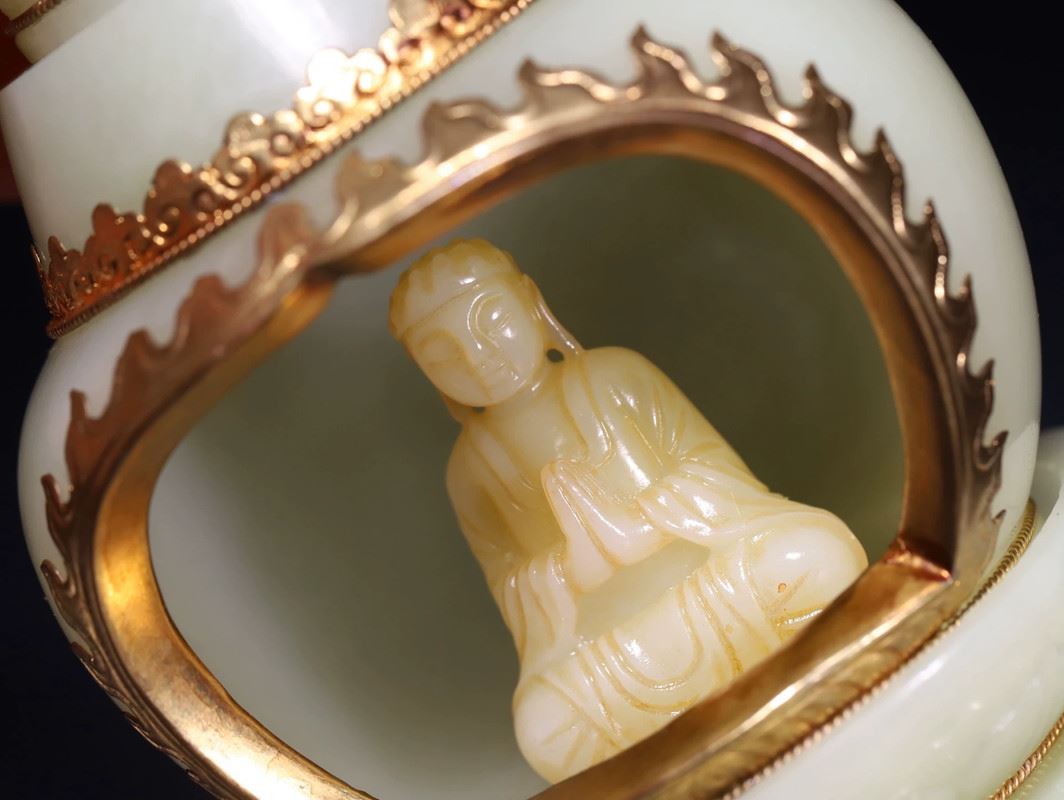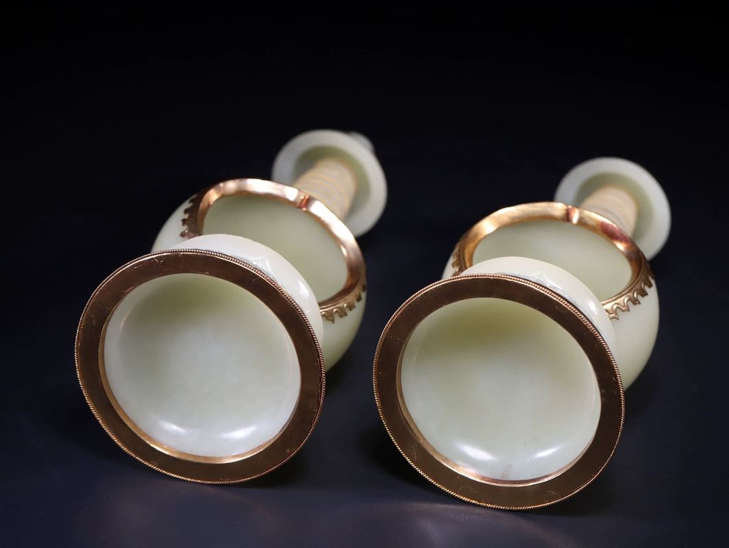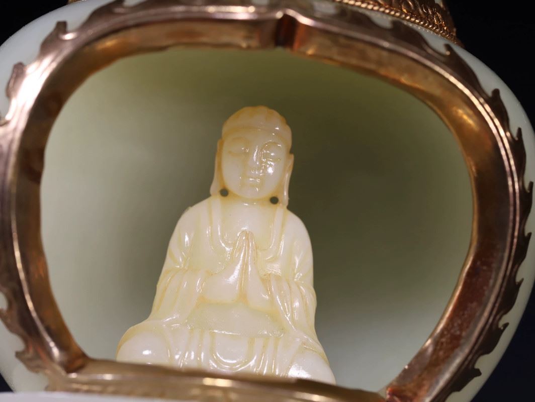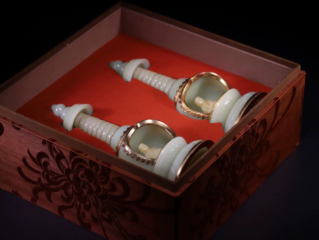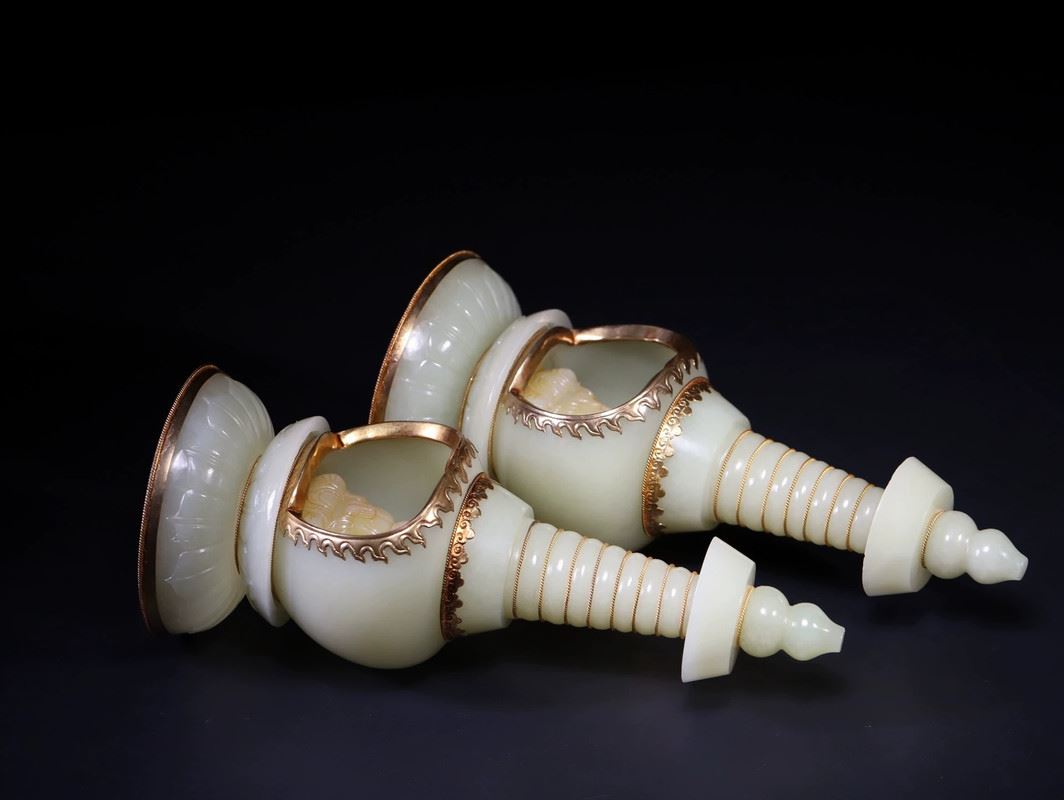 A pair of exquisite celadon lamps, each featuring a spiraled tower design, with a serene Buddha figure inside the base. The lamps are adorned with golden accents, enhancing their elegance. These pieces exude both tranquility and sophistication, making them a striking addition to any collection or living space.