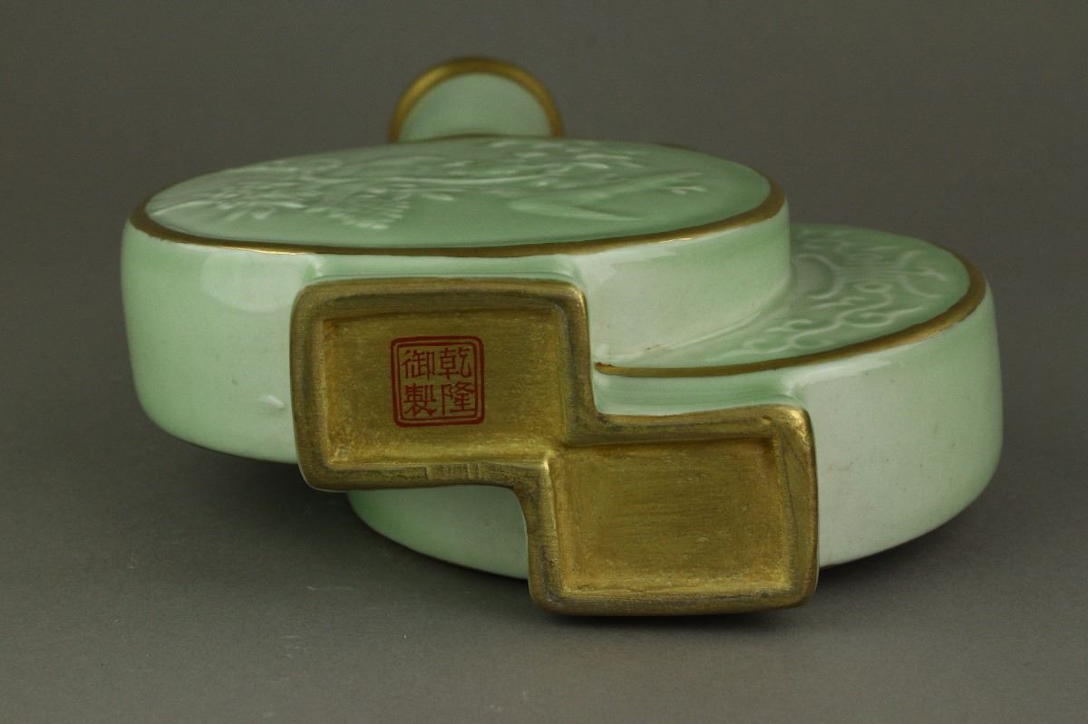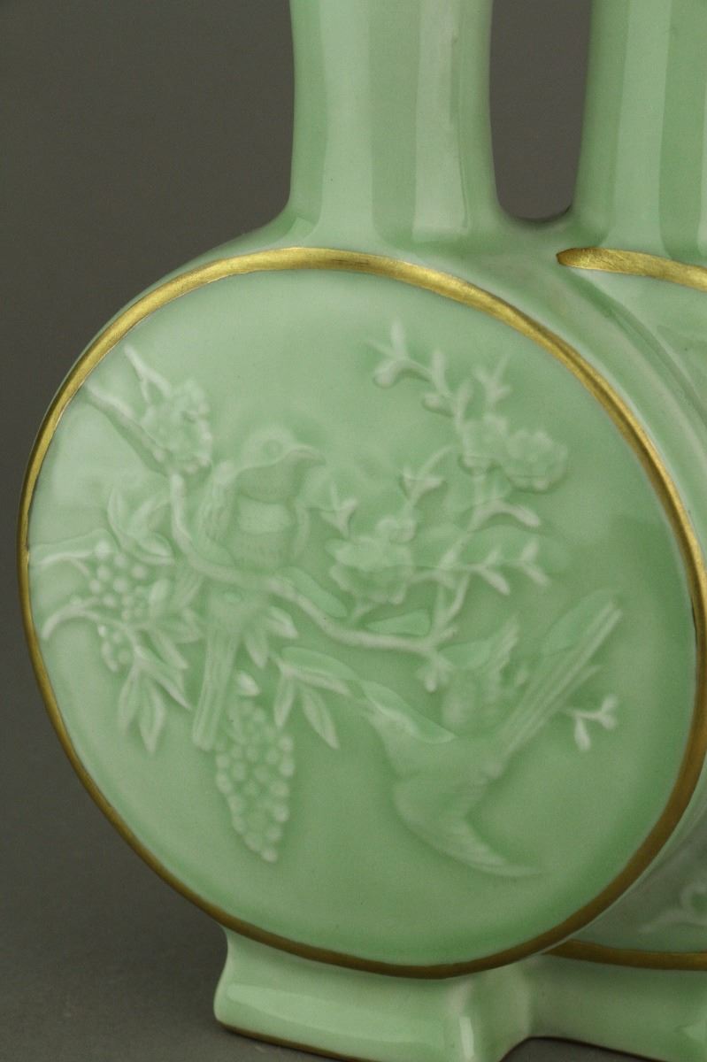 Chinese gilt celadon ground porcelain conjoined vase; each of flattened circular body with cylindrical neck; decorated with raised flowers and birds; four-character Qianlong mark on gilt base; H: 20 cm, W: 16 cm, 843 grams