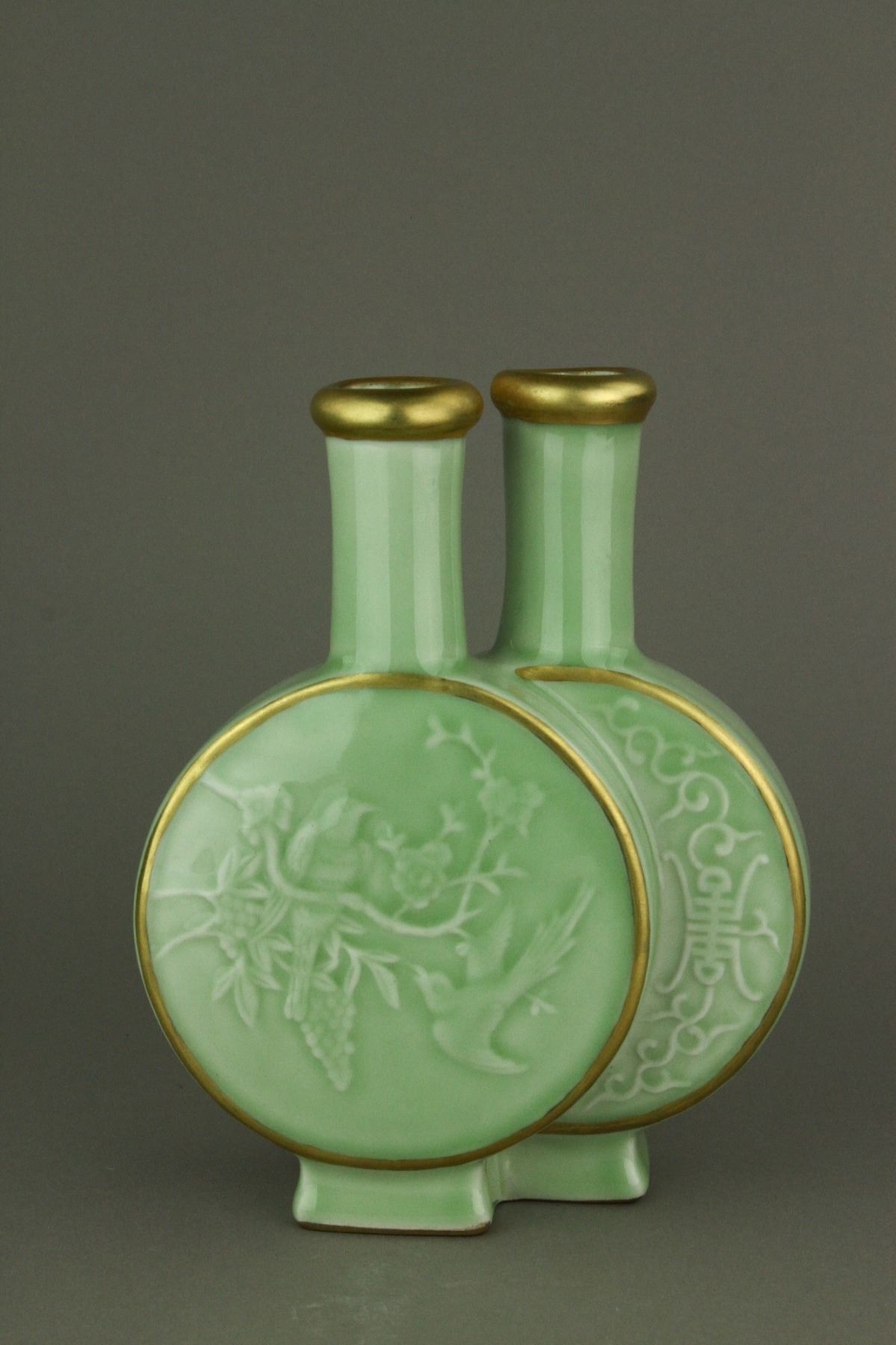 Chinese gilt celadon ground porcelain conjoined vase; each of flattened circular body with cylindrical neck; decorated with raised flowers and birds; four-character Qianlong mark on gilt base; H: 20 cm, W: 16 cm, 843 grams