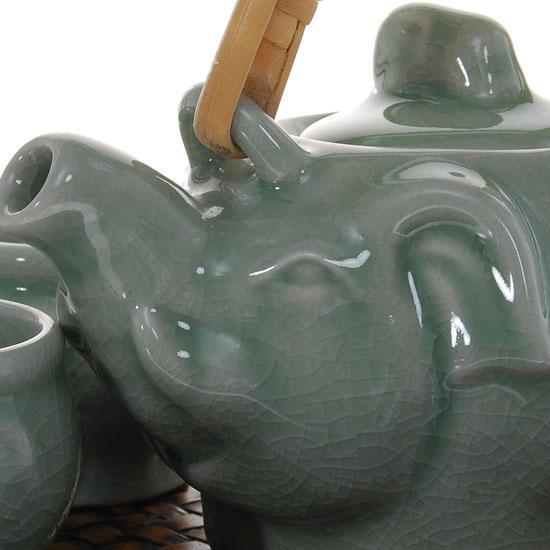 Excellent crackle glazed green celadon set with tray and 4 cups, pot 6", cups 2", tray 9"