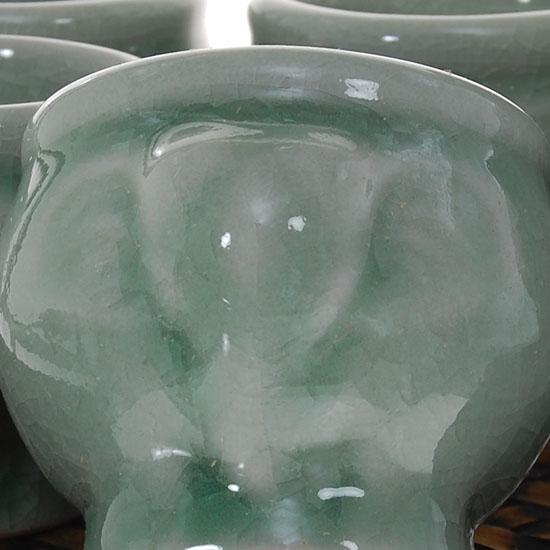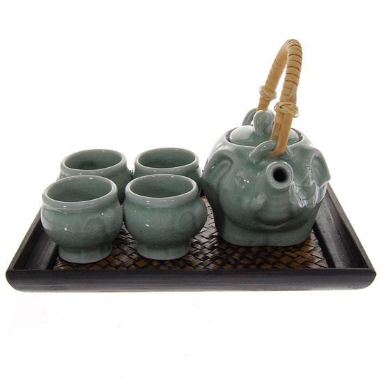 Excellent crackle glazed green celadon set with tray and 4 cups, pot 6", cups 2", tray 9"
