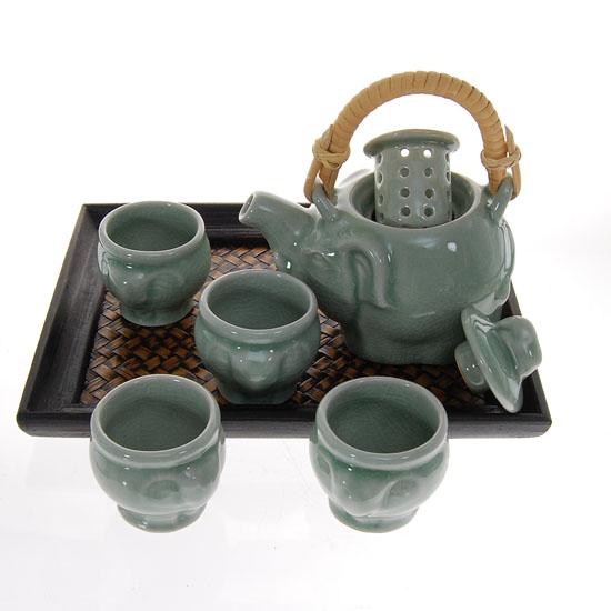 Excellent crackle glazed green celadon set with tray and 4 cups, pot 6", cups 2", tray 9"