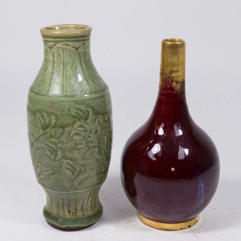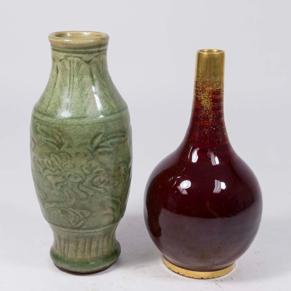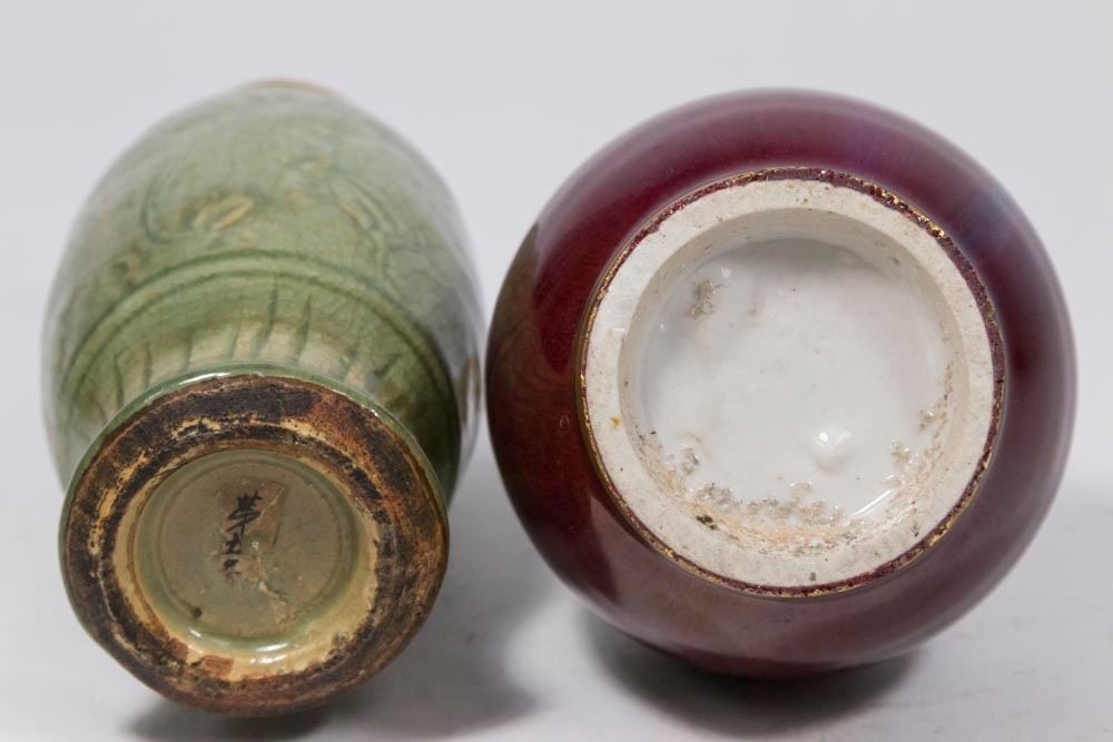 Celadon approx. 8 1/2" H and Chinese approx. 8" H. Property from the collection of Hank Willoughby, Allenwood, NJ. Flakes on edge of red vase.