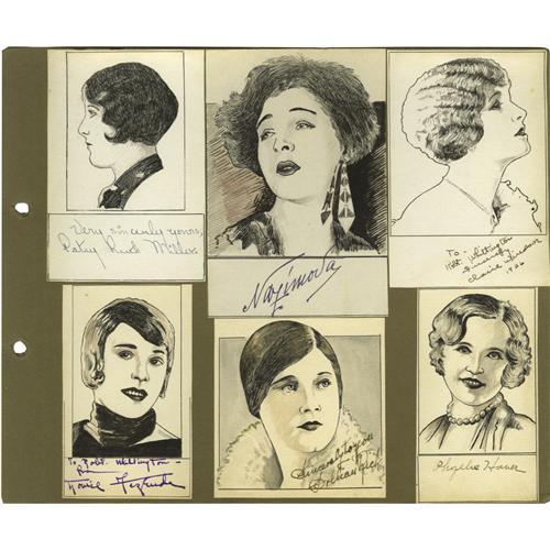 <B>Original Celebrity Sketches Signed By Gary Cooper and Others.</B></I> A selection of nine small pen-and-ink sketches by Robert L. Whittington of various celebrities from the Golden Age of Hollywood, signed by their respective subjects and affixed to a pair of 11.5" x 9.5" photo album pages. Included are Gary Cooper, Irene Nazimova, Gilda Gray, and Claire Windsor. In overall Excellent condition with occasional instances of tanning and/or soiling.<BR><BR><b>Shipping:</b> Flat Material, Small (<a target="_blank" href="http://www.heritageauctions.com/common/shipping.php">view shipping information</a>)