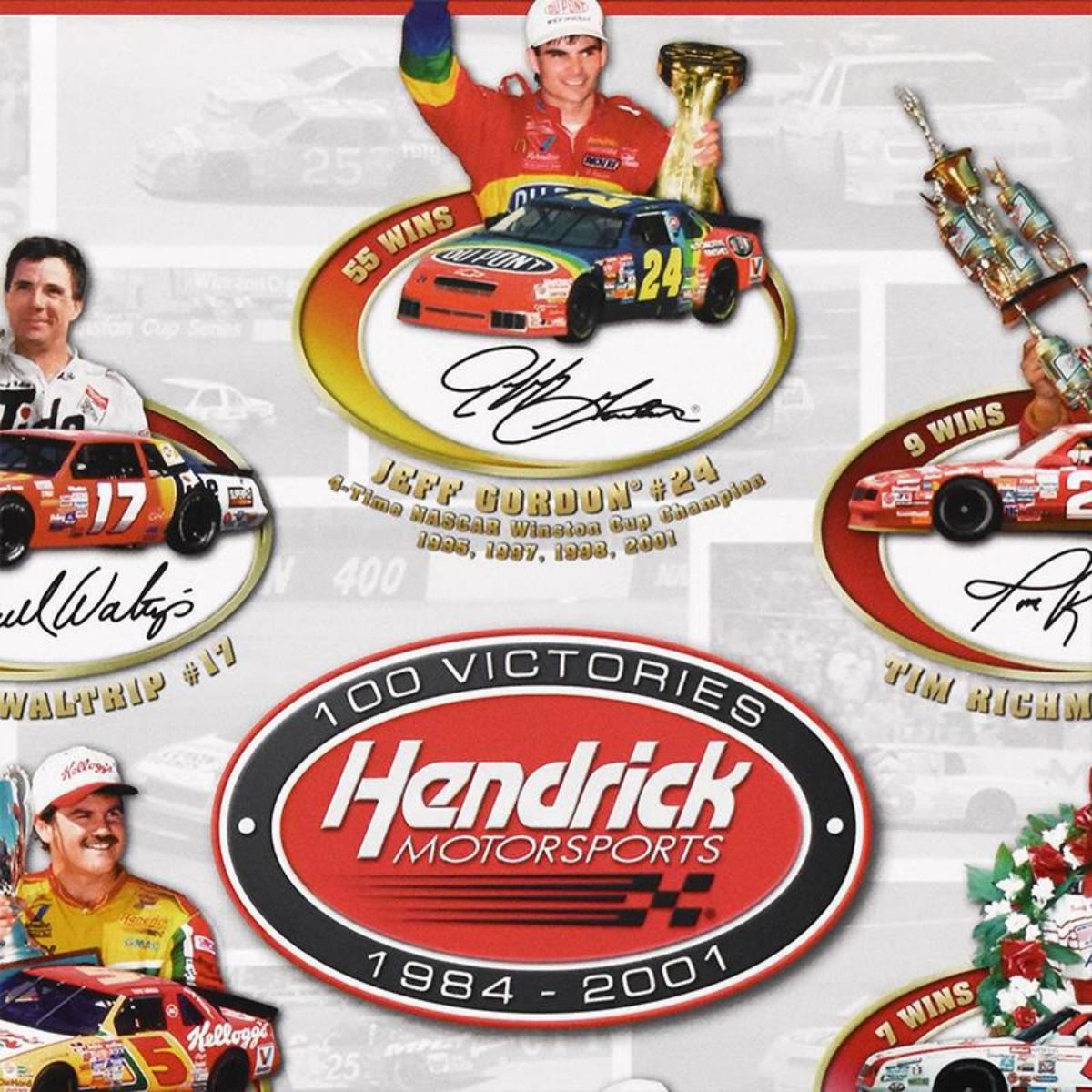 "Celebrating 100 Victories" is a limited edition collectible poster from an edition size of 10,1000. This piece bears the plate signatures of such NASCAR greats Jeff Gordon, Rick Hendrick, Ricky Rudd and more. Includes Letter of Authenticity. Measures approx. 20" x 24". Reference #: 218501.