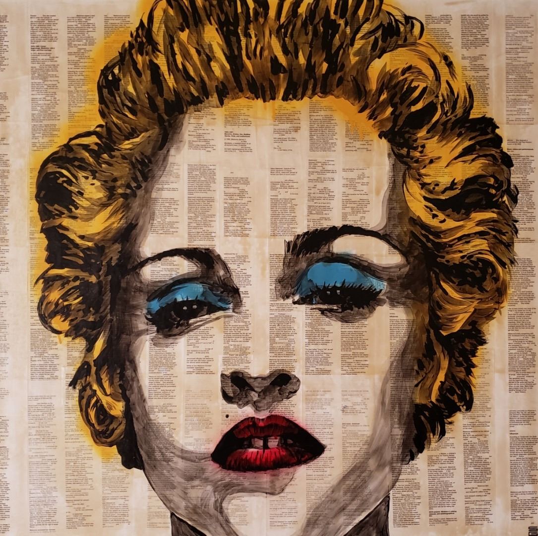 36x36 Acrylic on Canvas. According to Rodrigo Fres, "saying that Madonna is just a pop star is as inappropriate as saying that Coca-Cola is just a soda. Madonna is one of the classic symbols of Made in USA." Rolling Stone Spain wrote, "She became the first master of viral pop in history, years before the internet was massively used. Madonna was everywhere; in the almighty music television channels, 'radio formulas', magazine covers and even in bookstores. A pop dialectic, never seen since the Beatles's reign, which allowed her to keep on the edge of trend and commerciality."