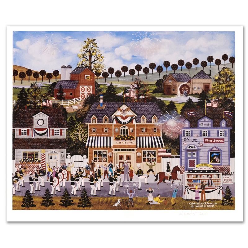Cozy, down-home images of a bygone era when life was simpler - this is the feeling captured in the creations of one of the world's most recognized artists. "Celebration of America" is a limited edition lithograph on paper, numbered and hand signed by Wooster Scott! Includes Certificate of Authenticity! Measures approx. 22" x 19.5" (with border), 20" x 16" (image).