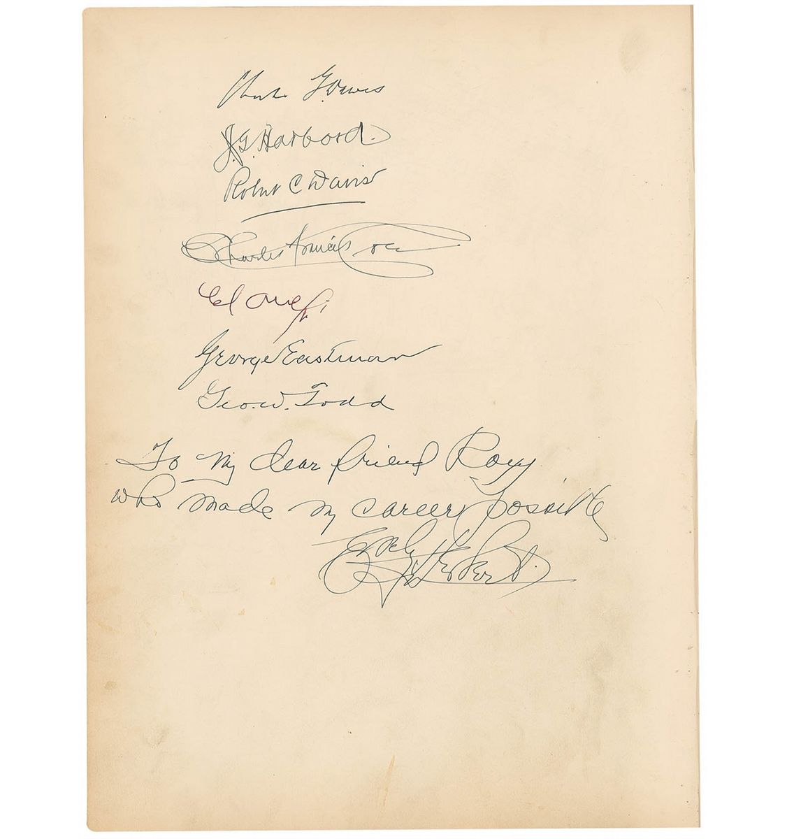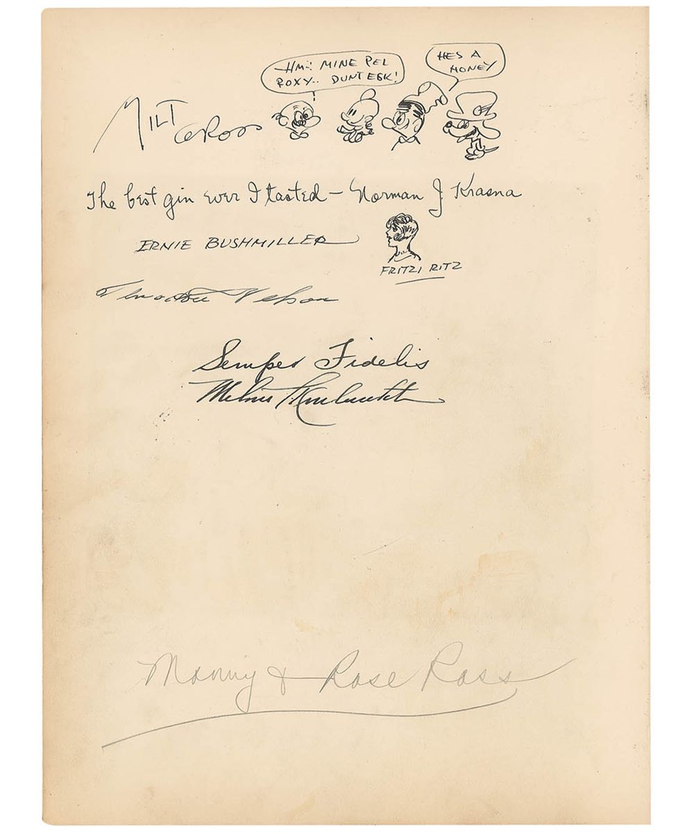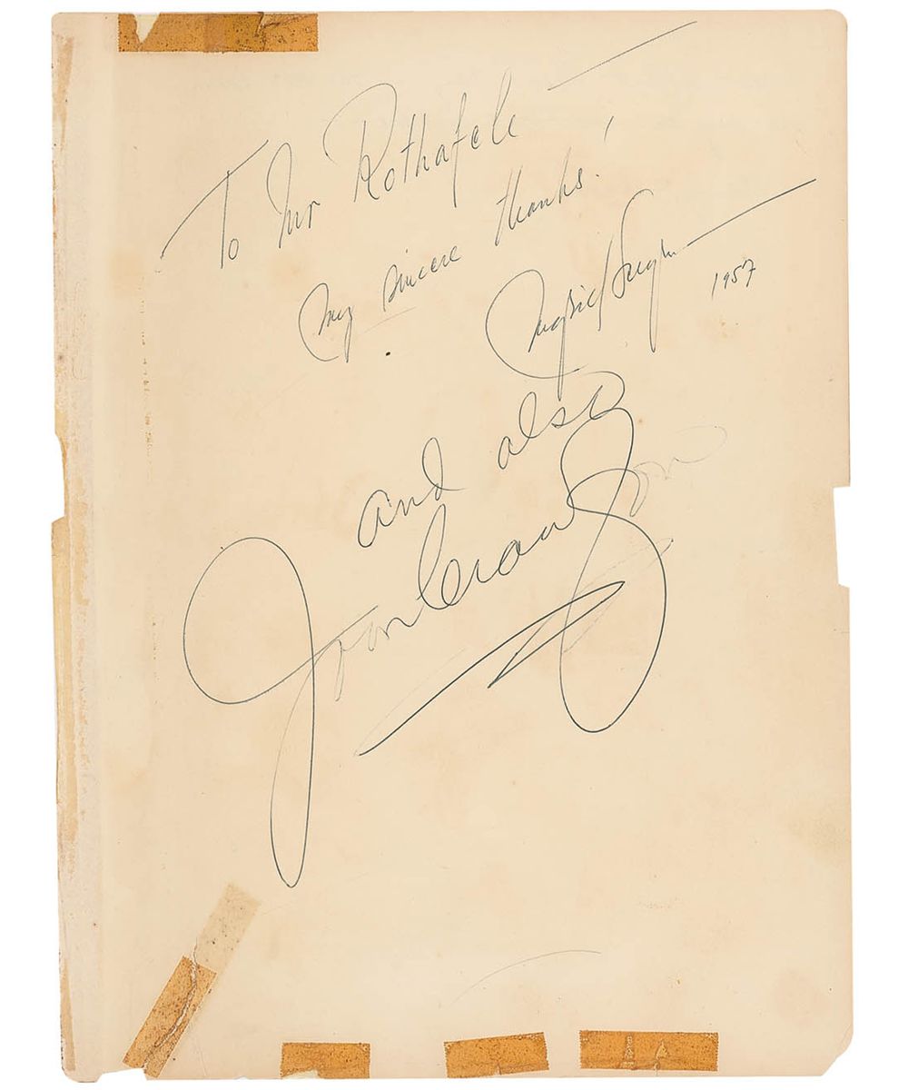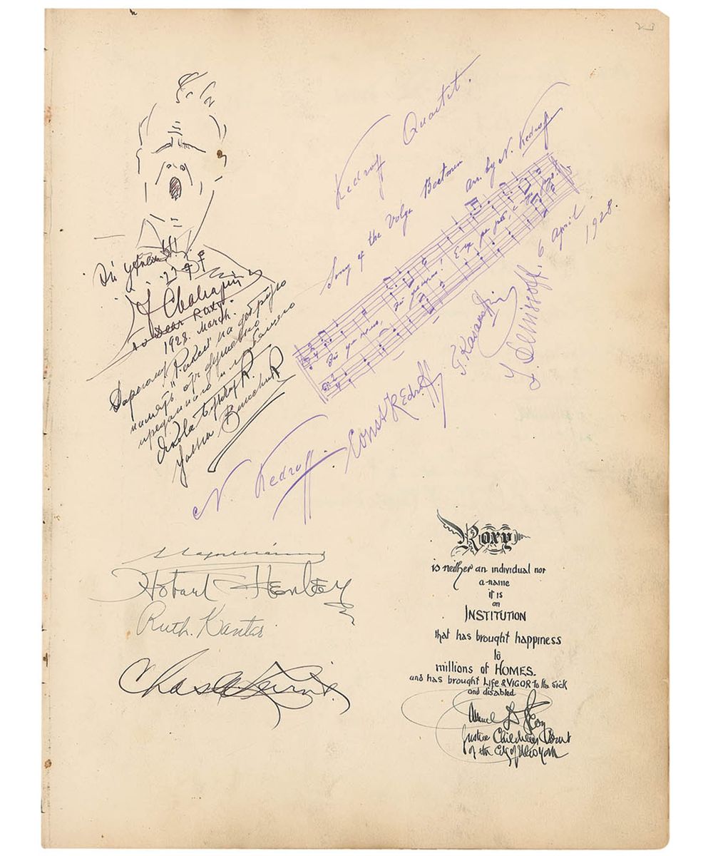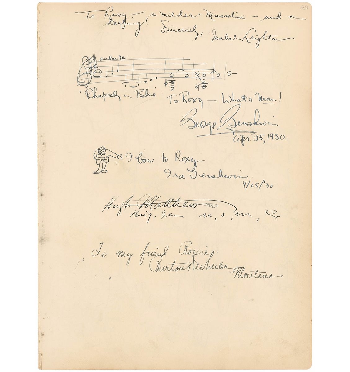 Incredible autograph book, 10.5 x 14, 56 pages, with a number of signatures of celebrities inside, many inscribed to ‘Roxy.’ Of particular note is a page with an AMQS of the first few bars of ‘Rhapsody in Blue,’ titled by Gershwin and signed and inscribed “To Roxy—what a man! George Gershwin, Apr. 25, 1930,” and below, his brother draws a quick self-portrait sketch of himself bowing, signed “I bow to Roxy—Ira Gershwin, 4/25/30.” Feodor Chaliapin has also drawn a self-portrait of himself singing, signing “F. Chaliapin,” with a brief AMQS below. Original signed sketches also come from cartoonists George McManus, Ernie Bushmiller, Milt Gross, and Harry Hershfield. Other signers include: Jack Dempsey, Douglas Fairbanks, Sr., Richard Byrd, Norma Shearer, Irving Thalberg, Max Reinhardt, Grantland Rice, Charles G. Dawes, George Eastman (the only full signature we have seen), Jimmy Doolittle, Louella Parsons, Arturo Toscanini, Victor McLaglen, James J. Walker, John Philip Sousa, Irwin S. Cobb, Fannie Hurst, Ingrid Bergman, and Joan Crawford. Also affixed is a TLS from Calvin Coolidge, expressing thanks for a Christmas gift. Also of interest are two unsigned ‘radiograms’ affixed within the book, sent by Richard Byrd from his Antarctic base, ‘Little America.’ Many friends and military acquaintances have also signed the book. Covers are no longer present and many pages have separated from the binding, but individual pages remain unharmed but for expected light toning and soiling. With music, literary, political, and entertainment icons, this book offers an incredibly wide range of celebrities—a fantastic picture of American culture as the ‘roaring twenties’ came to a close.