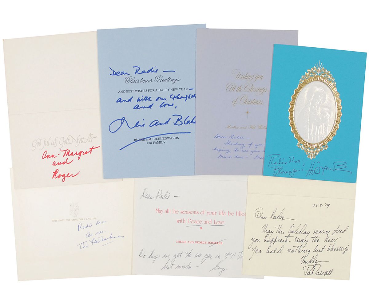 Collection of seven Christmas and holiday cards sent to journalist Radie Harris, each signed or notated by a celebrity. Signers are: Julie Andrews, Douglas Fairbanks, Jr., Pat Randall, Martha Hyer, Hildegarde, Ann-Margaret, and George Schaefer. Also includes six cards with printed sentiments or notes from the celebrity’s spouse, sent by Helen Hayes, Vincente Minnelli, Lynn Redgrave, Johnny Green, Peter Finch, and Ray Massey. In overall fine condition.