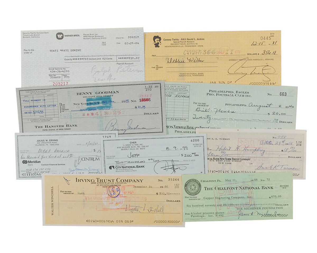 Diverse collection of nine checks of various types and sizes, each signed or endorsed by a notable figure. Signers are: Julius Erving, Cher, James Michener, Walter Winchell, Conway Twitty, Fats Domino, Benny Goodman, Bert Bell, and Hubert H. Humphrey. In overall fine condition, with various bank stamps, notations, and cancellation holes.