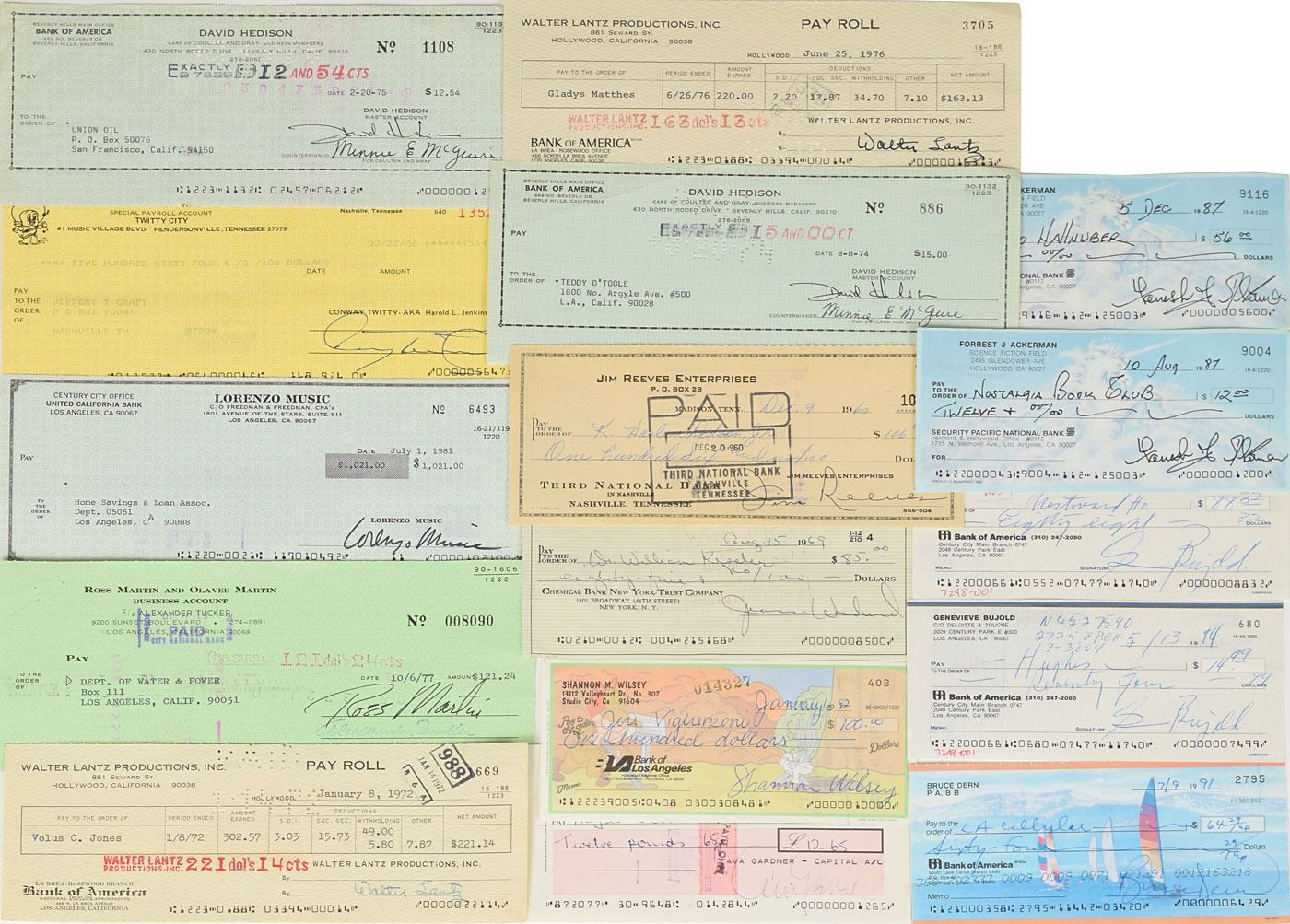 Collection of 16 checks signed by a variety of notable celebrities, including: Forrest J. Ackerman (2), Genevieve Bujold (2), Bruce Dern, Ava Gardner, David Hedison (2), Walter Lantz (2), Ross Martin, Lorenzo Music, Jim Reeves, Savannah, Conway Twitty, and Joanne Woodward. In overall fine condition.