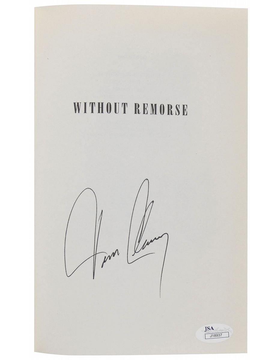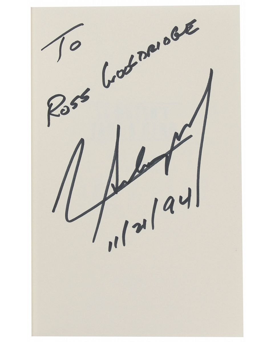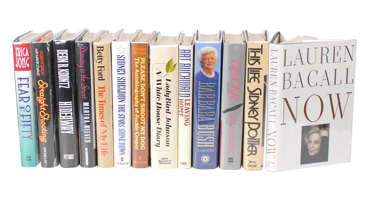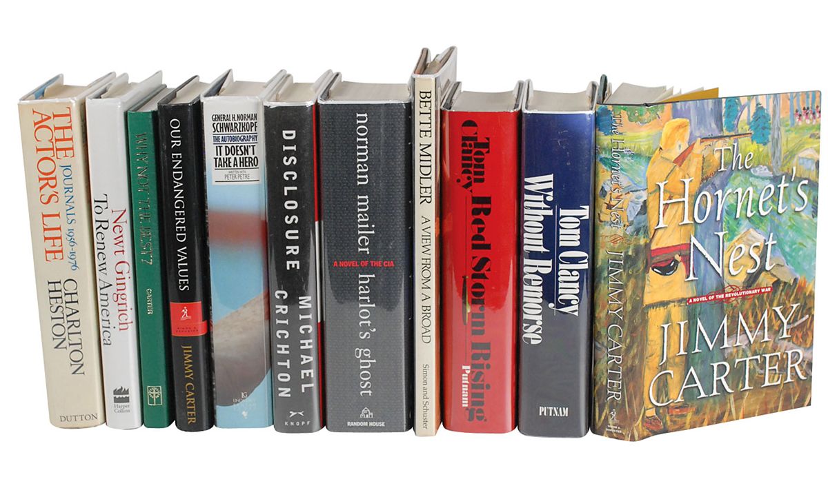 Twenty-four hardcover books, each signed on an opening page by the book’s author, with several inscribed. Signers are: Jimmy Carter (Why Not the Best, The Hornet’s Nest, and Our Endangered Values, with one signed on a bookplate); Tom Clancy (Red Storm Rising and Without Remorse); Michael Crichton (Disclosure); Bette Midler (A View from Beyond); Norman Mailer (Harlot’s Ghost); Charlton Heston (The Actor’s Life); Newt Gingrich (To Renew America, signed on a bookplate); Martha Reeves (Dancing in the Street); Lauren Bacall (Now); Jackie Cooper (Please Don’t Shoot My Dog); Sidney Sheldon (The Stars Shine Down); Dean Koontz (Hideaway); Betty Ford (The Times of My Life, signed on a bookplate); Robert Stack (Straight Shooter); Art Buchwald (Leaving Home); Ginger Rogers (Ginger); Sidney Poitier (This Life); Barbara Bush (A Memoir, signed on a bookplate); Erica Jong (Fear of Fifty); Lady Bird Johnson (A White House Diary, signed on a bookplate); and Norman Schwarzkopf (It Doesn’t Take A Hero). In fine condition, with a James Spence authentication label affixed to eight books. Accompanied by certificates of authenticity from James Spence for eight of the books.