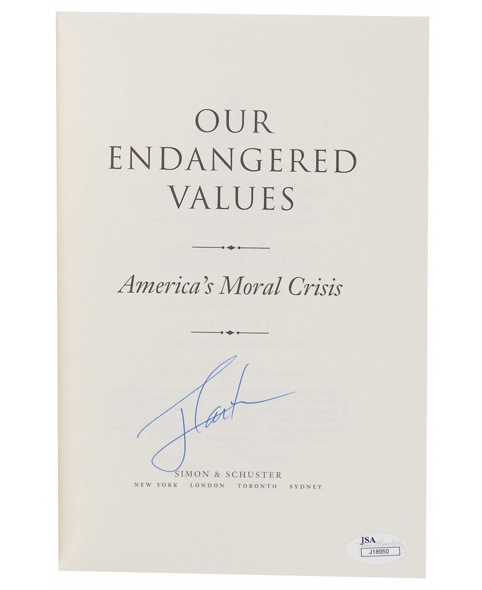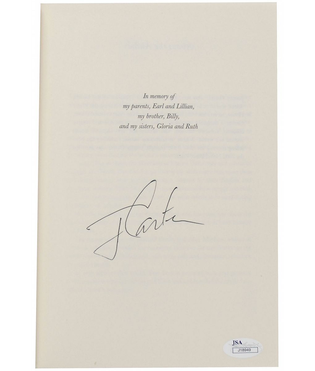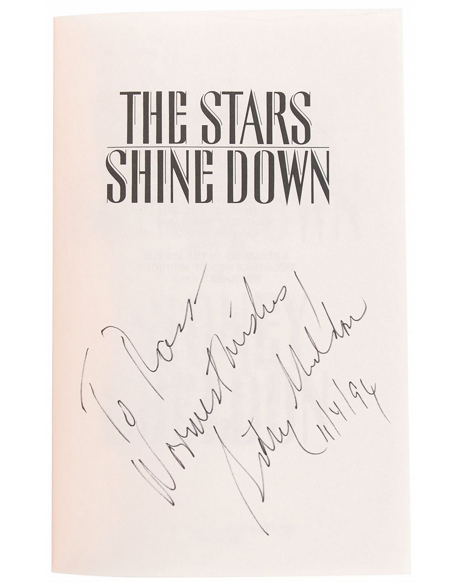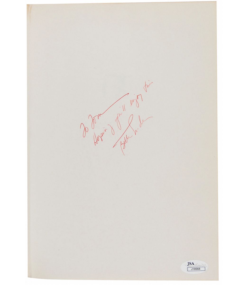Twenty-four hardcover books, each signed on an opening page by the book’s author, with several inscribed. Signers are: Jimmy Carter (Why Not the Best, The Hornet’s Nest, and Our Endangered Values, with one signed on a bookplate); Tom Clancy (Red Storm Rising and Without Remorse); Michael Crichton (Disclosure); Bette Midler (A View from Beyond); Norman Mailer (Harlot’s Ghost); Charlton Heston (The Actor’s Life); Newt Gingrich (To Renew America, signed on a bookplate); Martha Reeves (Dancing in the Street); Lauren Bacall (Now); Jackie Cooper (Please Don’t Shoot My Dog); Sidney Sheldon (The Stars Shine Down); Dean Koontz (Hideaway); Betty Ford (The Times of My Life, signed on a bookplate); Robert Stack (Straight Shooter); Art Buchwald (Leaving Home); Ginger Rogers (Ginger); Sidney Poitier (This Life); Barbara Bush (A Memoir, signed on a bookplate); Erica Jong (Fear of Fifty); Lady Bird Johnson (A White House Diary, signed on a bookplate); and Norman Schwarzkopf (It Doesn’t Take A Hero). In fine condition, with a James Spence authentication label affixed to eight books. Accompanied by certificates of authenticity from James Spence for eight of the books.