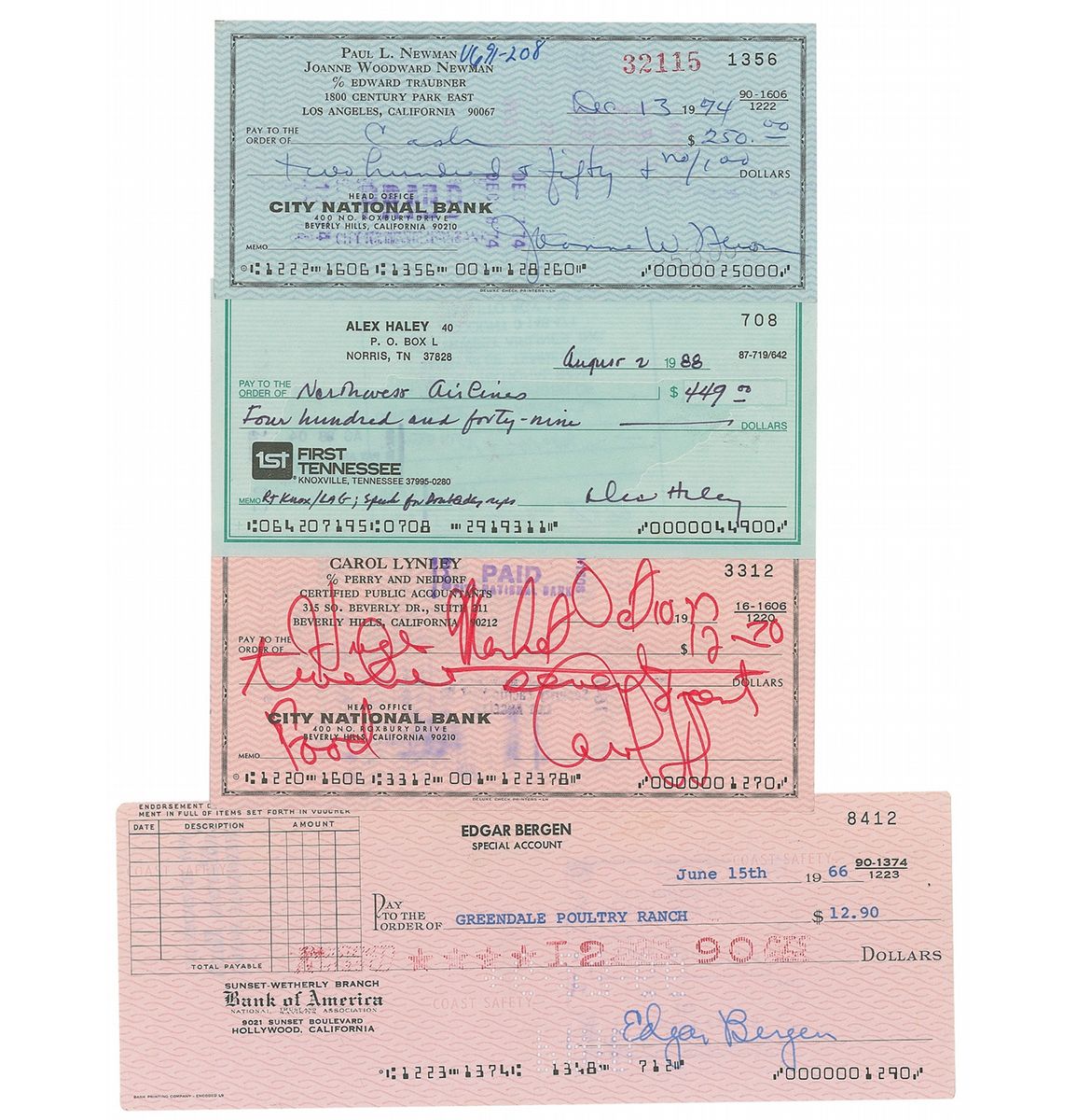 Four personal checks, ranging in size from 6 x 2.75 up to 8.25 x 3, dating from 1966–1988. Three filled out and signed by the celebrity: Alex Haley, Carol Lynley, and Joanne Woodward Newman; and one filled out in type and signed by Edgar Bergen. In fine condition, with expected stamps and cancellation holes, and a vertical fold to Bergen’s check.