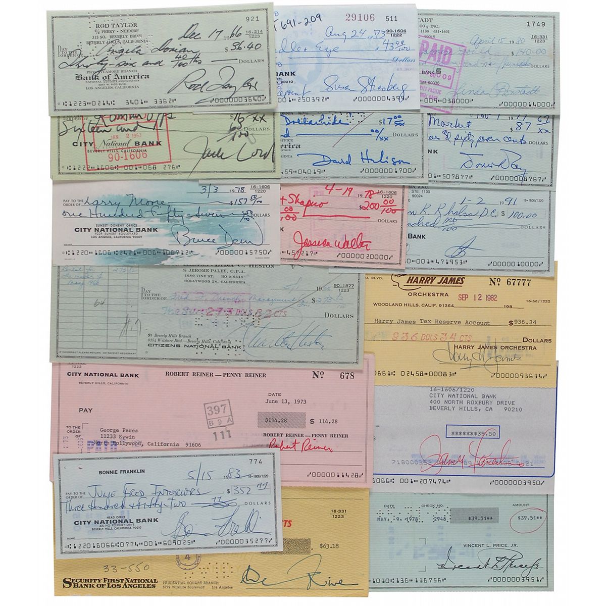 Collection of 16 personal and business checks, various sizes, 10 filled out and signed by a different actor or actress and six filled out in type and signed by an actor or actress. Checks filled out and signed are from Rod Taylor, Bonnie Franklin, Jessica Walter, Doris Day, David Hedison, Bruce Dern, Jack Lord, William Robinson, Jr., Susan Strasberg, and Linda Ronstadt; checks filled out in type and signed are from Charlton Heston, Rob Reiner, David Niven, Harry James, James Farentino, and Vincent Price. In overall fine condition.