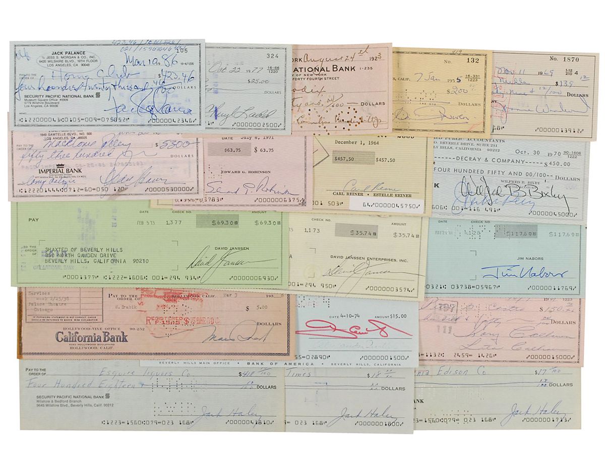 Collection of 18 checks, various sizes, some filled out and signed by the celebrity and some filled out in type. Signers are: Bill Bixby, Rory Calhoun, Glenn Ford, Jack Haley (3), Goldie Hawn, David Janssen (2), Cheryl Ladd, Jim Nabors, David Niven, Jack Palance, Carl Reiner, Edward G. Robinson (partial check), Cornelius Vanderbilt, Jr., Mae West, and Joanne Woodward. In very good condition, with expected stamps, holes, and folds.