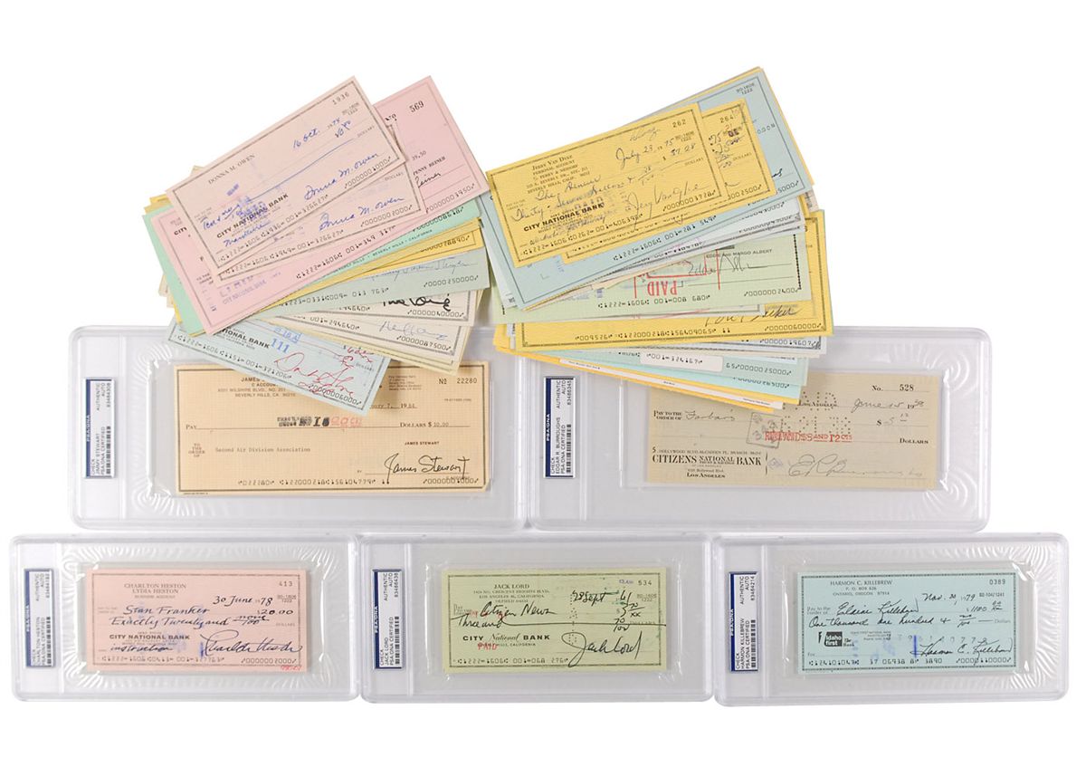 Collection of 95 personal and business checks, each signed by an actor, actress, athlete, or celebrity. Signers are: James Stewart, Edgar Rice Burroughs, Harmon Killebrew, Charlton Heston, Jack Haley, David Niven (3), Jack Lord, Peter Fonda, Bill Bixby, Rod Steiger (2), Doris Day (2), Chris George, Amanda Blake, Glenn Ash, Lisa Hartman, John Hillerman, Jack Donohue, Joanne Hunter, Joanne Kerns, Howard Keel (2), Alf Kjellin (2), Norman Krasna, Ross Martin, Sydney Pollack, Charles Nelson Reilly (2), Bob Barker, George Axelrod, Eddie Albert, Robert Foxworth, Michele Lee, Meg Foster, Rory Calhoun (3), Susan Blakely, Genevieve Bujold (2), Cornell Wilde, Jessica Walter (3), Carol Dempster (2), Danny Thomas (2), Joanne Worley, Kathleen Clifford, Rod Taylor (3), Jonathan Winters (3 endorsed), Bobby Vinton, Marlo Thomas, Jerry Van Dyke (2), Dinah Shore (2), Carl Reiner (3), Mel Torme (3), David Hedison (3), Susan Strasberg (3), Norman Panama, Linda Ronstadt, Jim Britt (2), Anne Lansky (2), Bob Newhart (3), John McGiver (2), Rob Reiner (2), and Donna Reed (2). The Stewart, Burroughs, Killebrew, Heston, and Lord checks are encapsulated in plastic PSA/DNA authentication holders. In overall fine condition, with expected stamps and holes.