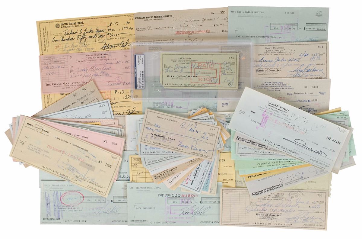 Huge collection of ninety-two checks, each signed by an actor, athlete, or celebrity, including: Glenn Ash (2); George Axelrod; Adrian Barbeau; A. C. Bartley; Warren Beatty; Genevieve Bujold; Edgar Rice Burroughs; Red Buttons; Rory Calhoun (3); Kathleen Clifford (4); Joan Collins; Jamie Lee Curtis (2); Doris Day (2); Carol Dempster (2); Bruce Dern (3); Blake Edwards; Glenn Ford (2); Meg Foster (2); Bonnie Franklin (2); Ava Gardner (2); Walter Grauman; Lisa Hartman; David Hedison (4); John Hillerman; Chester Huntley; Harry James; David Janssen; Howard Keel (2); Joanne Kerns (2); Deborah Kerr (2); David Keith (2); Sue Carol Ladd (2); Jack Lord; Jake LaMotta; Dante Lavelli; Carol Lynley (2); Ross Martin; John McGiver (2); Ken Murray; David Niven (3); Norman Panama; Eleanor Powell; Charles Nelson Reilly (2); Carl Reiner; Rob Reiner (2); Linda Ronstadt; Telly Savalas; Susan Strasberg (2); Bernie Taupin; Rod Taylor (2); Danny Thomas; Mel Torme; Jerry Van Dyke (2); Jessica Walter (2); John Waybill; Cornel Wilde (2); and Joanne Woodward. The Lord check is encapsulated in a plastic PSA/DNA authentication holder. In overall fine condition, with vertical folds, creases, and small tears, and expected bank stamps and cancellation holes.