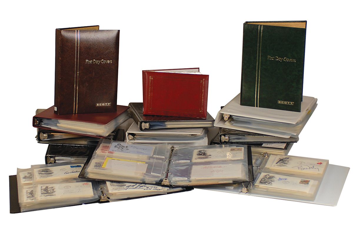 Large collection of approximately 950 FDCs, each individually signed in ink or felt tip by celebrities and notables from the fields of entertainment, music, art and literature,space, politics, public service (including Supreme Court Justices), and other fields. A small sampling of signers include: Fred Astaire, Leonard Bernstein, Frank Borman, Ray Bradbury, Pearl S. Buck, Jimmy Carter, Jack Dempsey, James Dootlittle, John Glenn, Rube Goldberg, Dick Gordon, Fred Haise, Thor Heyerdahl, J. Edgar Hoover, Ted Kennedy, Alexei Leonov, James Lovell, Norman Mailer, Thurgood Marshall, W. Somerset Maugham, Ron McNair, Sandra Day O’Connor, Norman Vincent Peale, Judith A. Resnik, Eddie Rickenbacker, Sally Ride, Jonas Salk, Harrison Schmitt, Clyde Tombaugh, Johnny Unitas, John Wooden, and Chuck Yeager. In overall fine condition. A more comprehensive list is available online at rrauction.com.