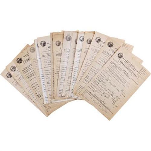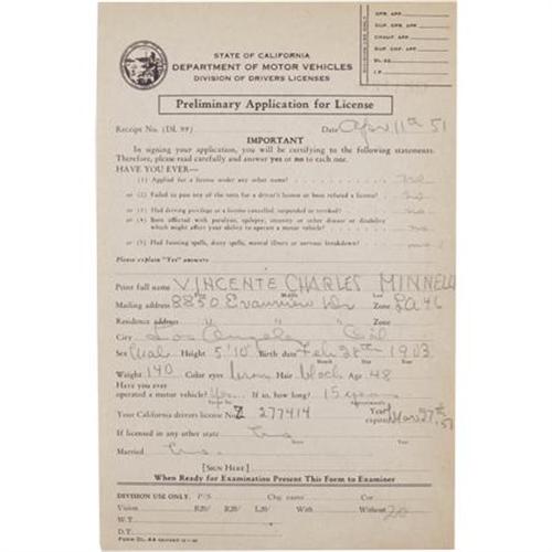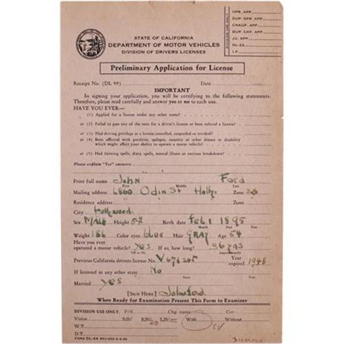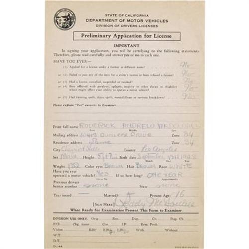 <B>Celebrity Signed California Driver's License Applications Circa 1940s.</B></I> This very cool -- and slightly unusual -- lot features 22 vintage preliminary driver's license applications from the California DMV, circa the 1940s, filled out and signed by Roddy MacDowall, Jack Oakie, Lillian Gish, Cyd Charisse, John Ford, Fritz Lang, Zero Mostel, Yvonne De Carlo, Vincente Minelli, and others. The forms are in overall Very Fine condition with mild wear and moderate toning. <I>Accompanied by LOA from PSA/DNA.</B></I><BR><BR><b>Shipping:</b> Flat Material, Small (<a target="_blank" href="http://www.heritageauctions.com/common/shipping.php">view shipping information</a>)