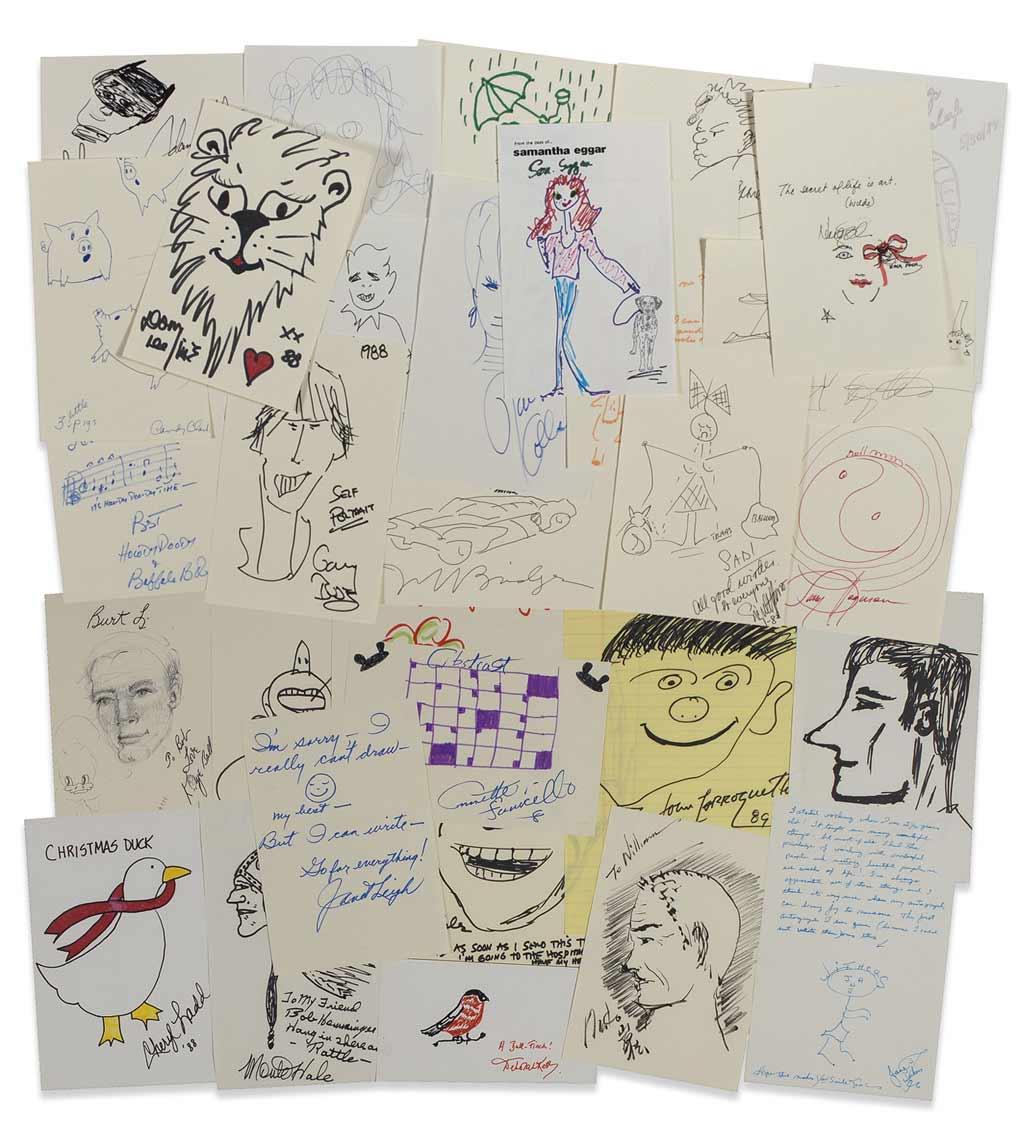 Huge collection of 140 original ink, pencil, and felt tip sketches, various sizes and subjects, with many self-portraits, each signed by the respective celebrity artist. Sketches are by: Blythe Danner, Rosemary DeCamp, Ossie Davis, Robert Cummings, Richard Crenna, Joyce Compton, Jackie Collins, Imogene Coca, Candy Clark, William Christopher, Marge Champion, Dixie Carter, Diana Canowa, Gary Busey, Buffalo Bob Smith, Les Brown, Jeff Bridges, Beau Bridges, Eileen Brennan, June Havoc, Signe Hasso, Richard Harris, Ed Harris, Barbara Hale, Larry Hagman, Virginia Grey, Farley Granger, Alice Ghostley, Eva Gabor, Annette Funicello, Anne Francis, Sally Forrest, Nina Foch, Ed FlandersJamie Farr, Mike Farrell, Samantha Eggar, Irene Dunn, Hugh Downs, Phyllis Diller, Bruce Dern, Arlene Dahl, Dom DeLuise, Doris Day, Howard Hessman, Gloria Henry, Florence Henderson, Tippi Hedren, Mary Healy, Peter Lind Hayes, James Earl Jones, Arte Johnson, Elaine Joyce, Anne Jackson, Larry Holmes, Gavin McLeod, Tina Louise, Gwen Verdon, Gale Storm, LArry Storch, Peggy Stewart, Tisha Sterling, Arnold Stang, Robert Stack, Tom Skerritt, Penny Singleton, Martin Short, Martin Sheen, Dick Van Patton, Ben Vereen, Leslie Ann Warren, Adam West, Jessie White, Cornel Wilde, Bransby Williams, Treat Williams, William Windom, Paul Winfield, Marie Windsor, Jane Withers, Debra Winger, Michael York, James Woods, Art Linkletter, Jay Leno, Janet Leigh, Sugar Ray Leonard, John Larroquette, Deborah Kerr, Sally Kirkland, Cheryl Ladd, Raymond Hitchcock, Hal Holbrook, Mako, Julie London, Jerry Lewis, Buddy hackett, Soupy Sales, Tony Randall, Monte Hale, Will Hutchins, Fred Scott, John Saxon, Dick Sargent, Eva Marie Saint, Marion Ross, Cesar Romero, Esther Rolle, Roxie Roker, ‘Buddy’ Rogers, George Robey, Anne Revere, Lynn Redgrave, Deborah Raffin, Jane Powell, Ryan O’Neal, Guy Madison, Tim Matheson, Rue McClanahan, Kelly McGillis, Ed McMahon, Butterfly McQueen, Lee Mreiwether, Denny Miller, Vic Morrow, Roger Mudd, Martin Mull, Barry Newman, Patrick O’Neal, Billy Lee, Michael Ansara, Eddie Bracken, Ernest Borgnine, Richard Benjamin, Billy Barty, Martin Balsam, Kay Ballard, Jim Backus, Ed Asner, Bea Arthur, Heather Angel, and Danny Aiello. In fine overall condition.